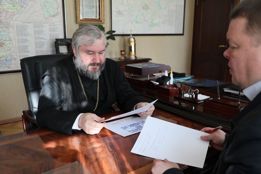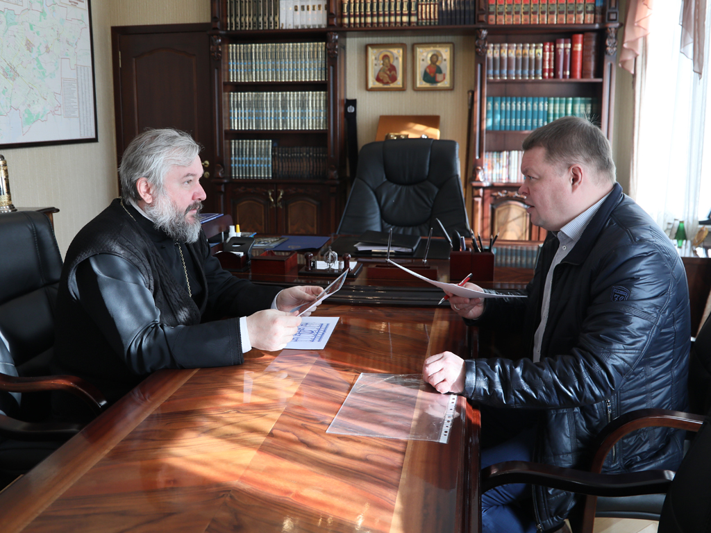 Преосвященнейший епископ Симон и глава Администрации города Донецка Р.В. Кураев провели рабочую встречу в Епархиальном управлении города Шахты
