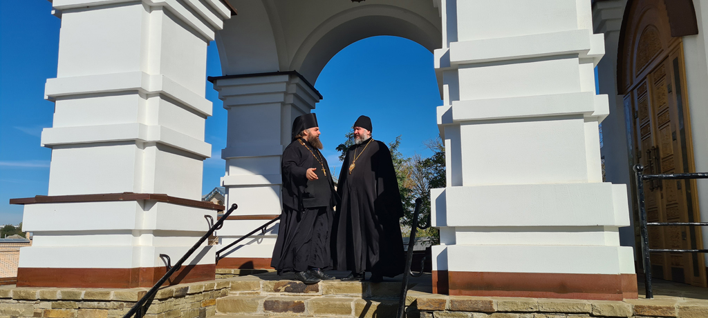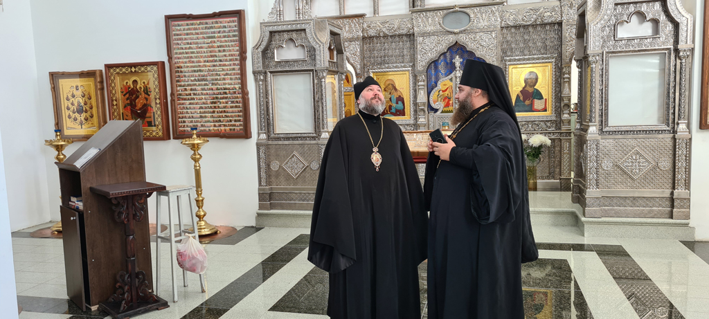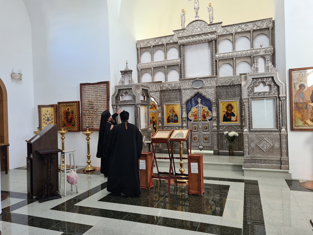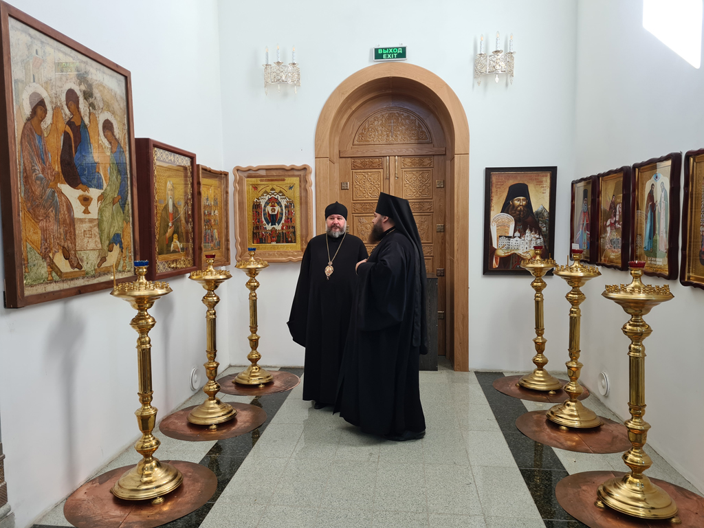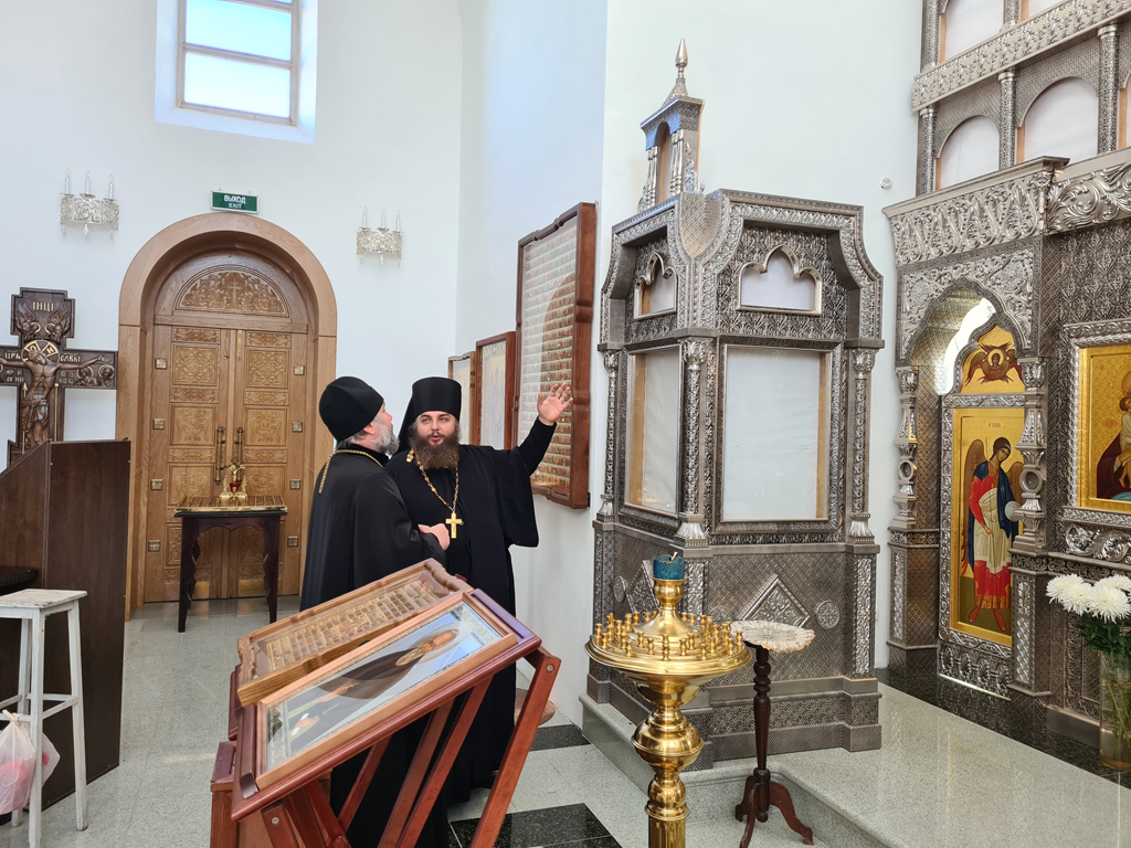 Владыка Симон и иеромонах Варнава обсудили архитектурное решение для клироса, также архиерей дал рекомендации по благоукрашению нижней части храмового комплекса.