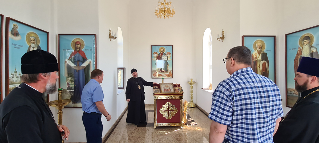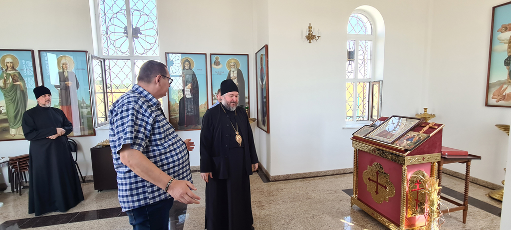 Иерей Роман и благотворители рассказали о проделанных работах как в самом храме, так и на прилежащей территории. Ознакомившись с храмом, владыка Симон благословил подготовить проект иконостаса.