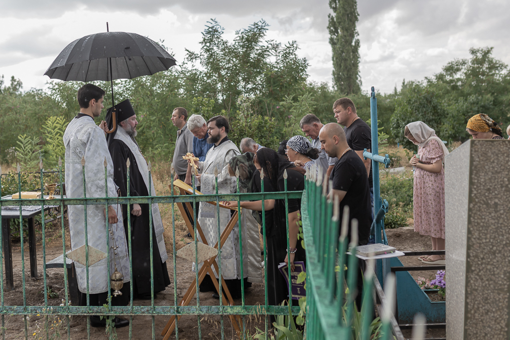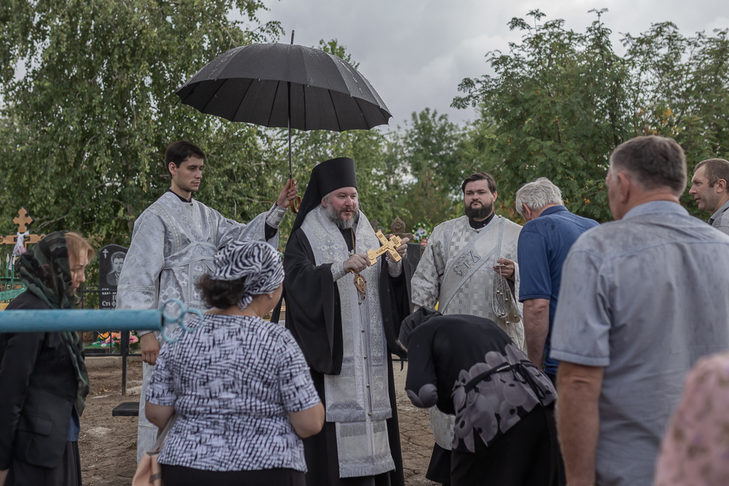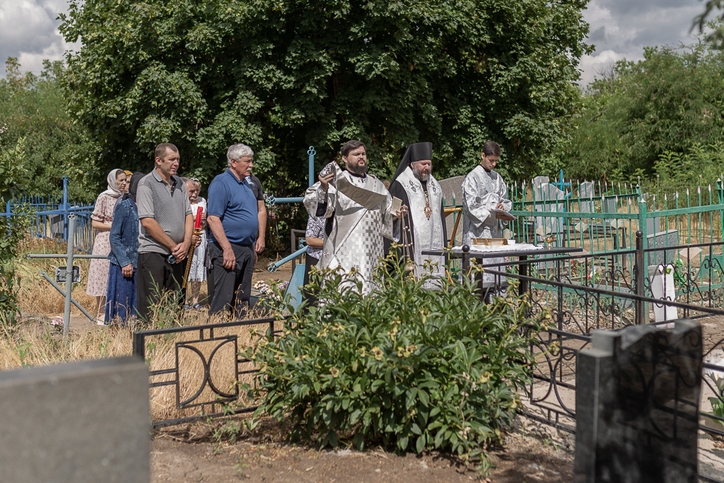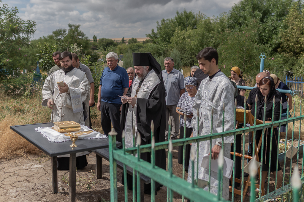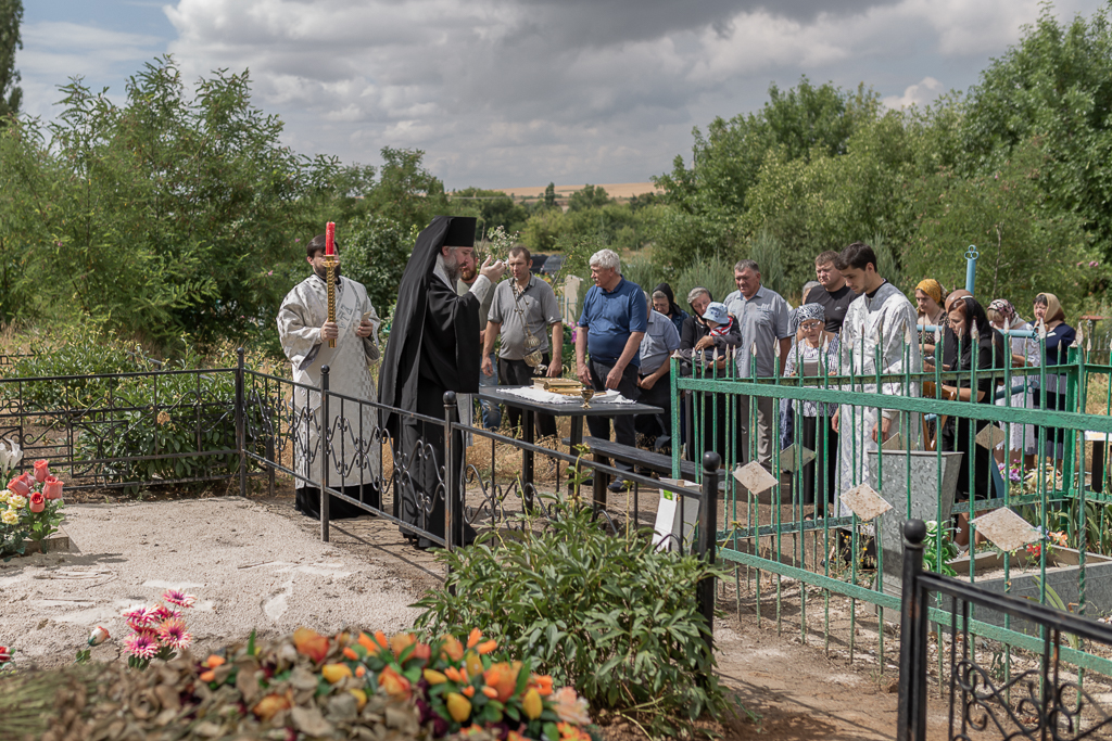 После Литургии архиерей совершил панихиду на кладбище хутора, на месте захоронения новопреставленной Шевченко Нины Алексеевны, одной из старейших прихожанок Троицкого храма.