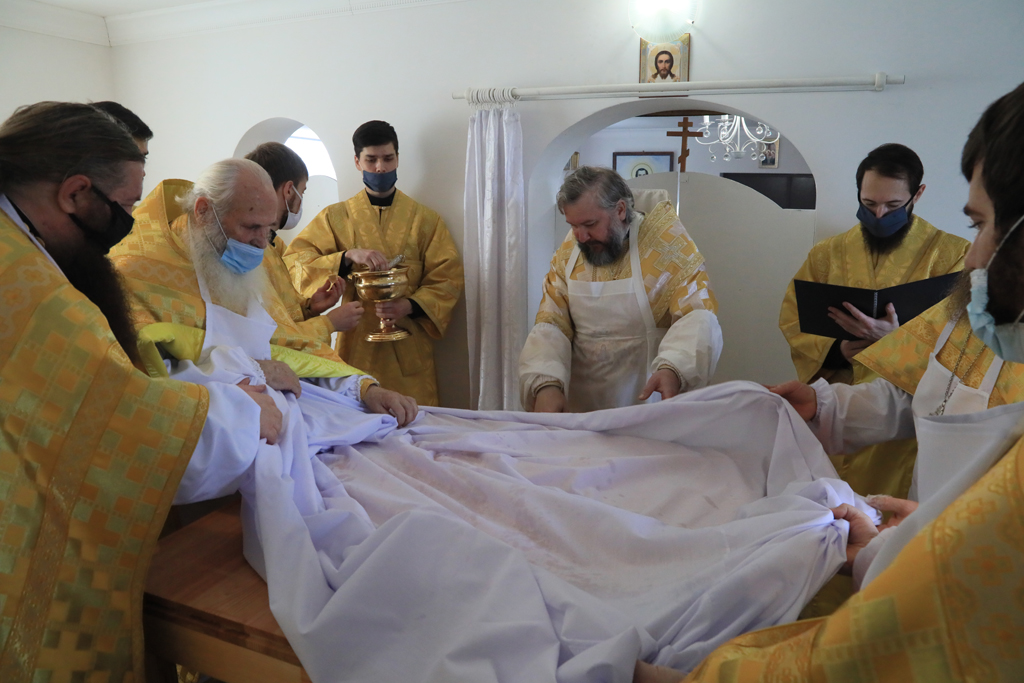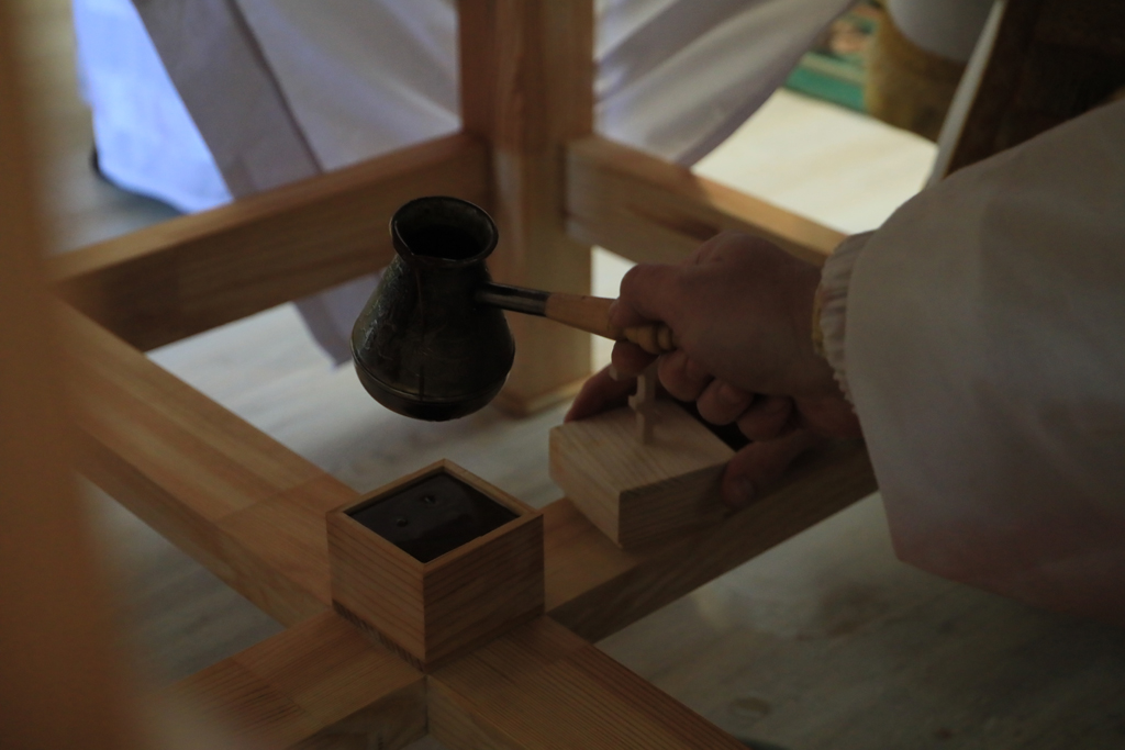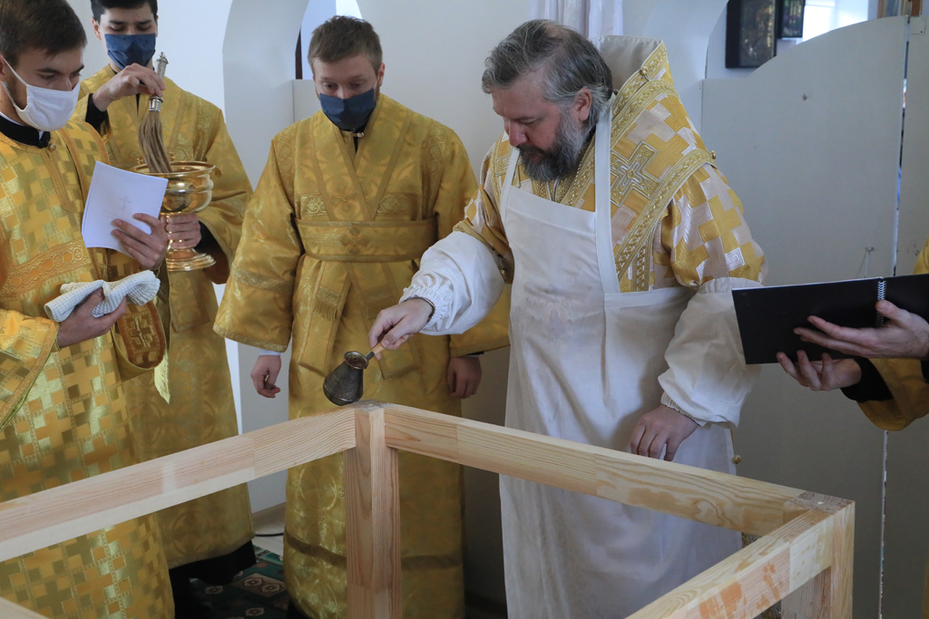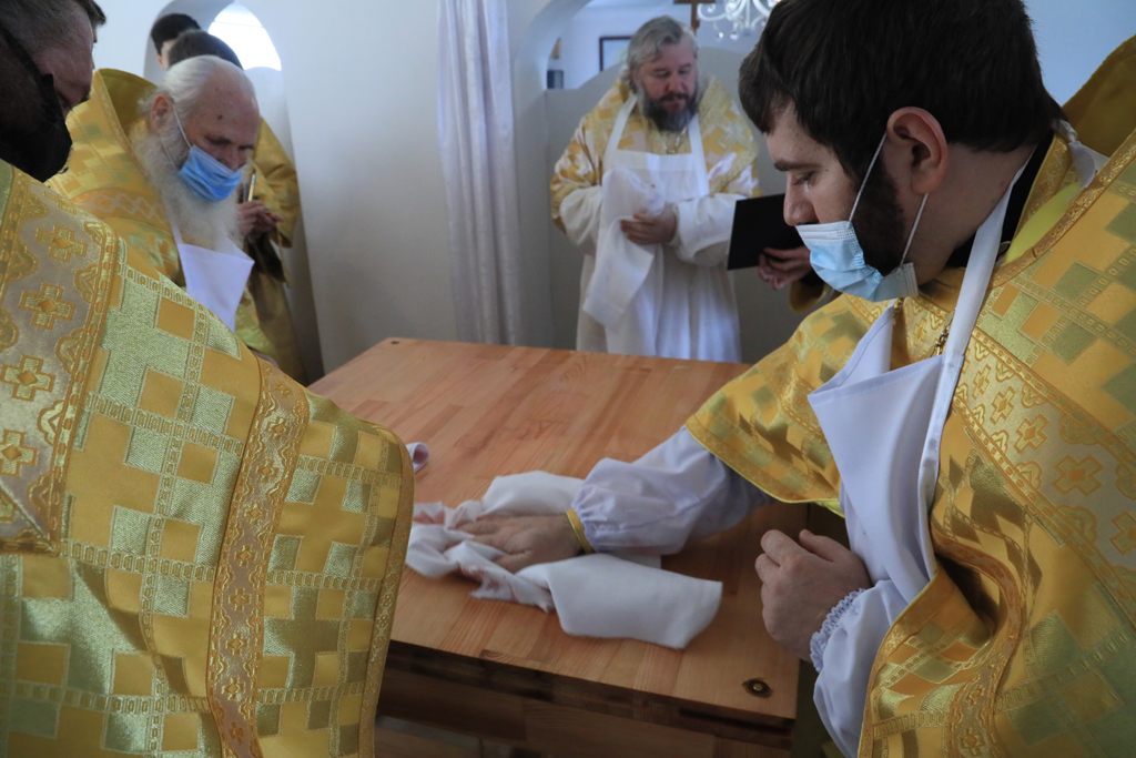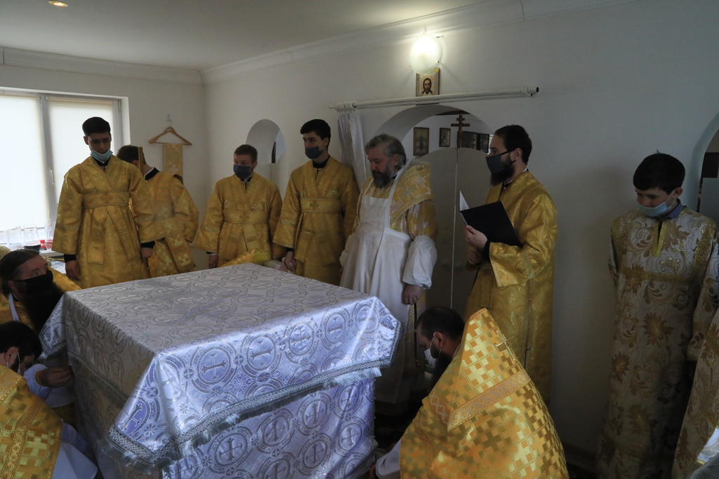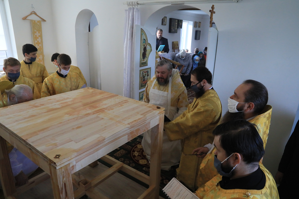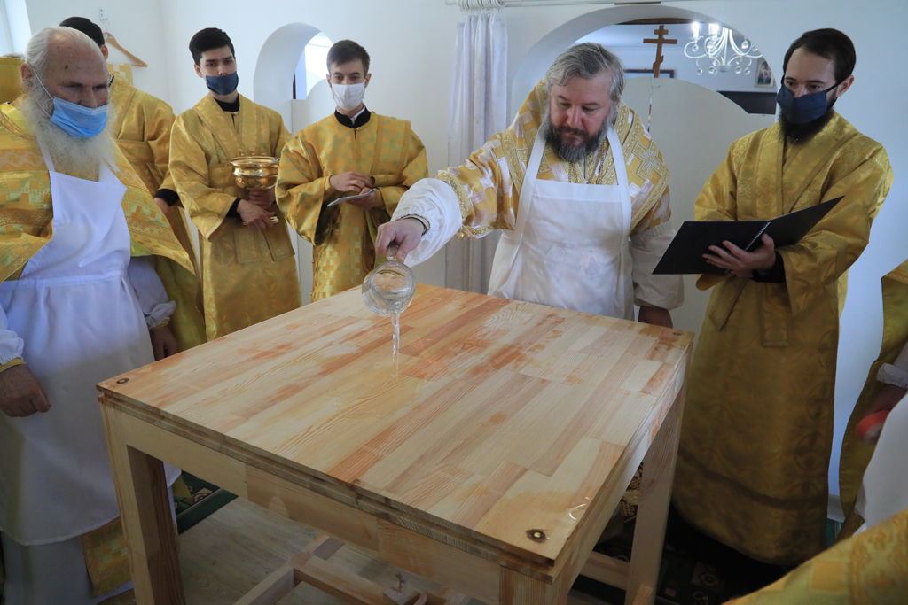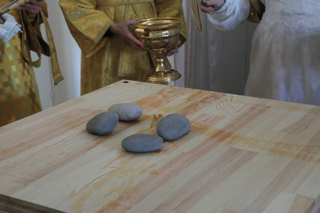 После помазания миром священнослужители облекли престол в одежды. Нижняя одежда была троекратно опоясана веревкой так, что на каждой стороне престола образовался крест.