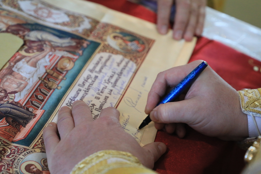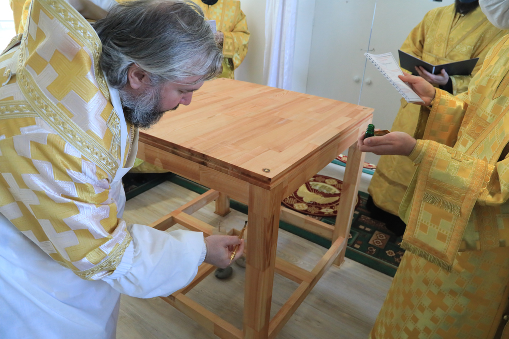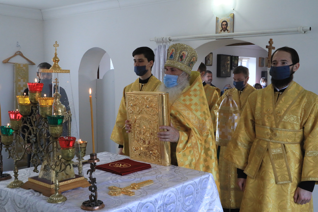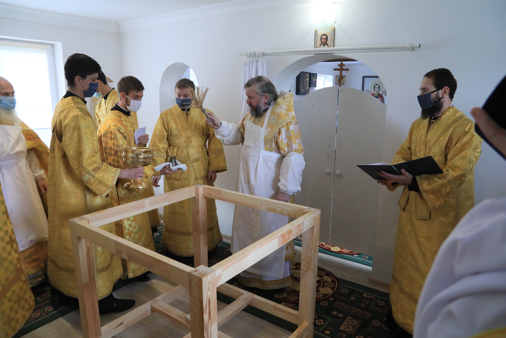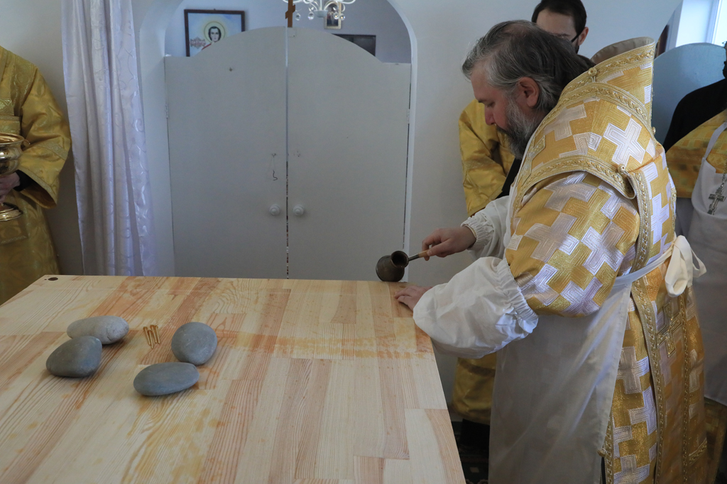 После престола был освящен и весь храм каждением, молитвой, кроплением святой водой и миропомазанием стен. Все молящиеся во главе с архипастырем совершили крестный ход вокруг храма.