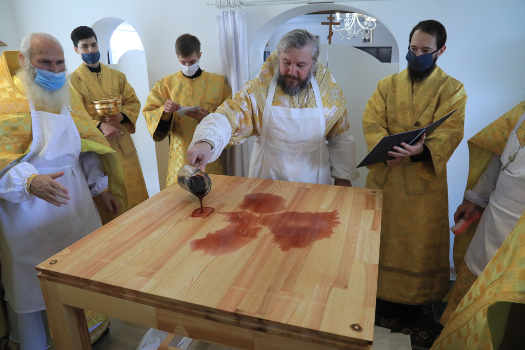 Священнослужители, совершающие чин, облачаются во все священные одежды, а сверху них надевают белые защитные запоны. Архиерей, благословив сослужителей, окропил святой водой столпы престола и углы его полил расплавленной воскомастикой. Затем окропил святой водой верхнюю доску престола, и она была положена на престольные столпы. После окропления архиереем четырех гвоздей они были вложены в углы престола, а священнослужители закрепили доску на престольных столпах камнями.