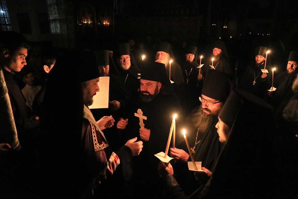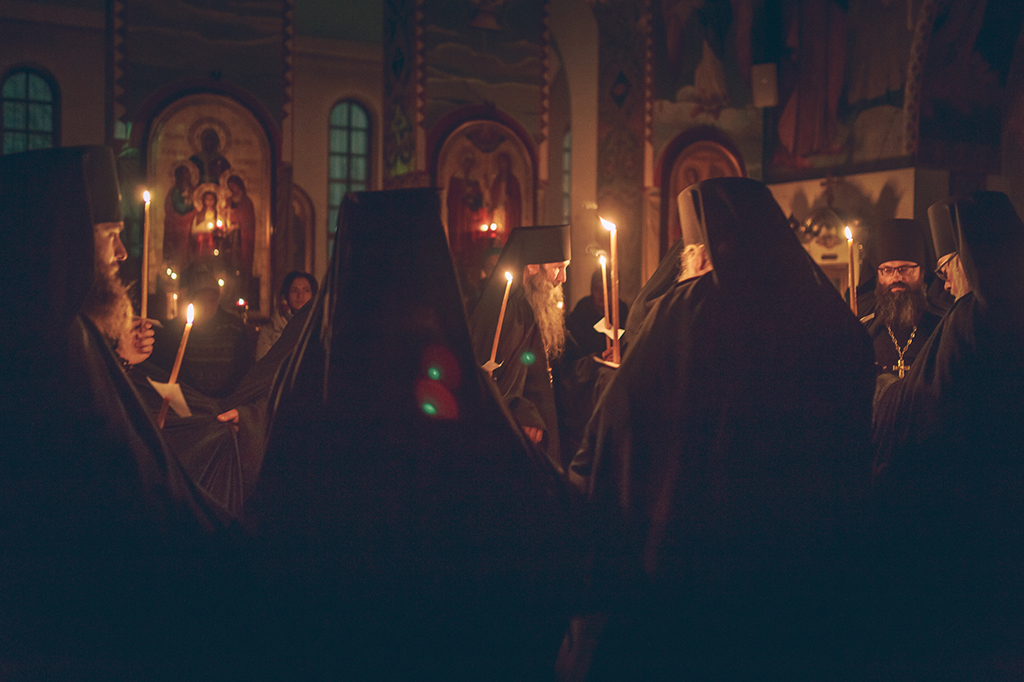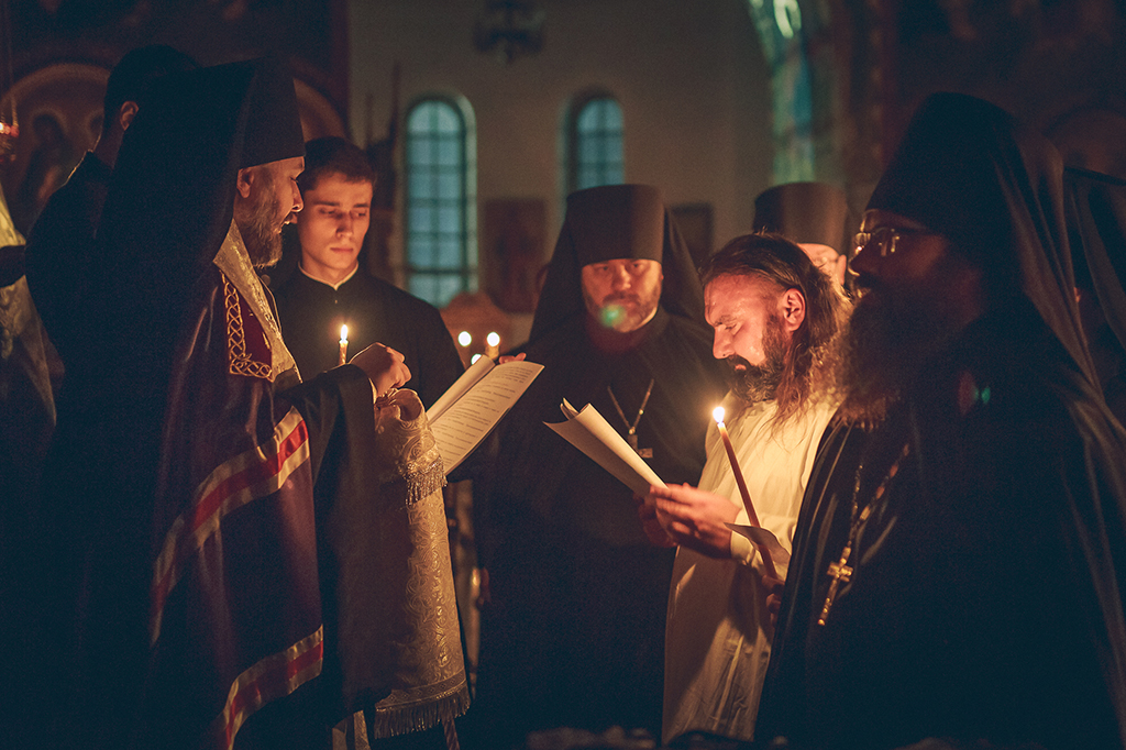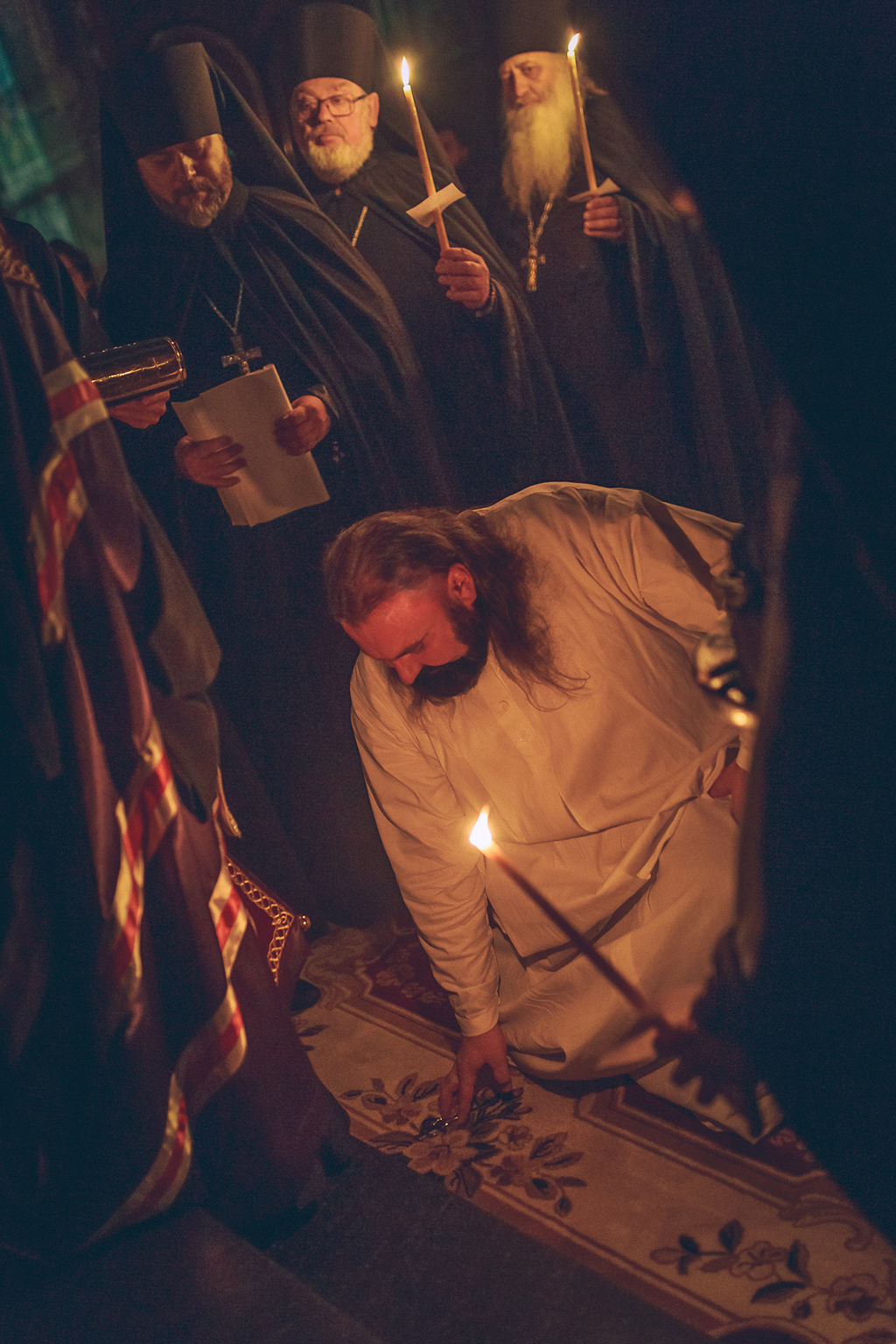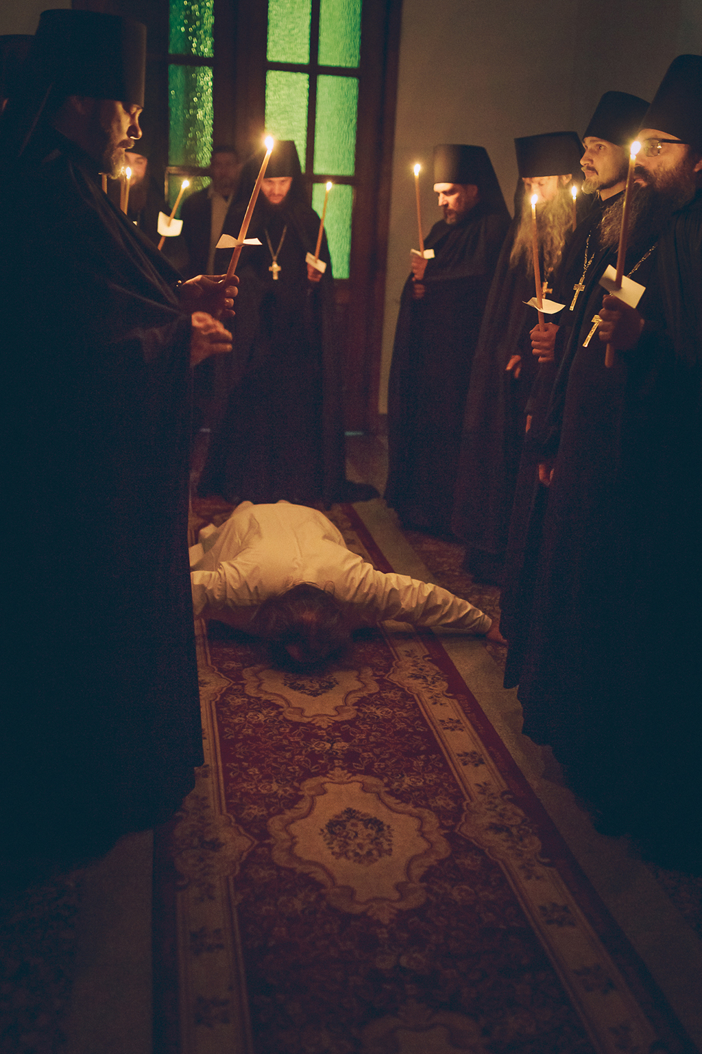 По расстеленной дорожке в храме постригаемый в знак своего смирения и покаяния от западной части, распинаясь, прополз к амвону. Монашеская братия епархии прикрывала постригаемого мантиями, пока тот полз к амвону и потом давал монашеские обеты.