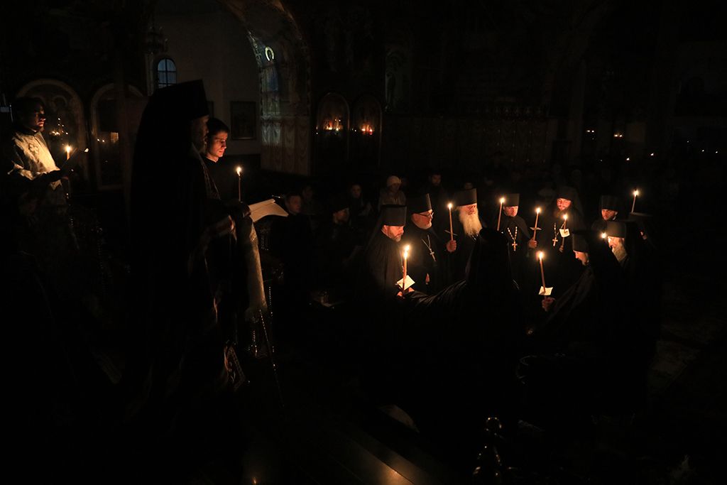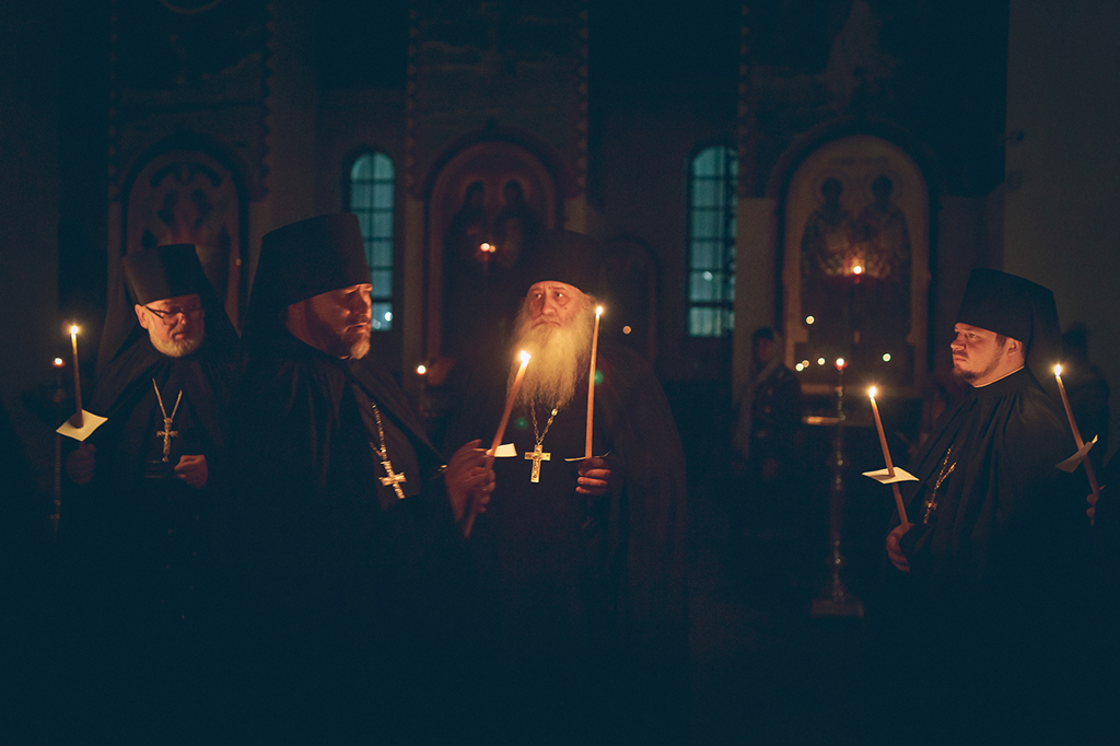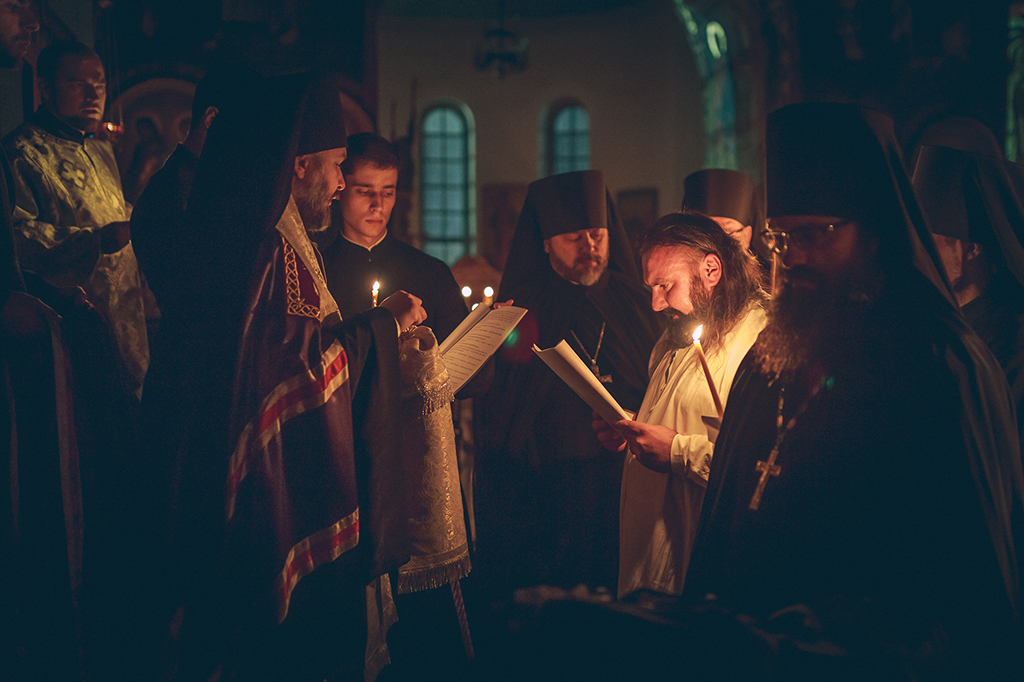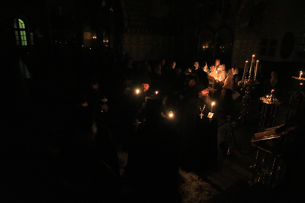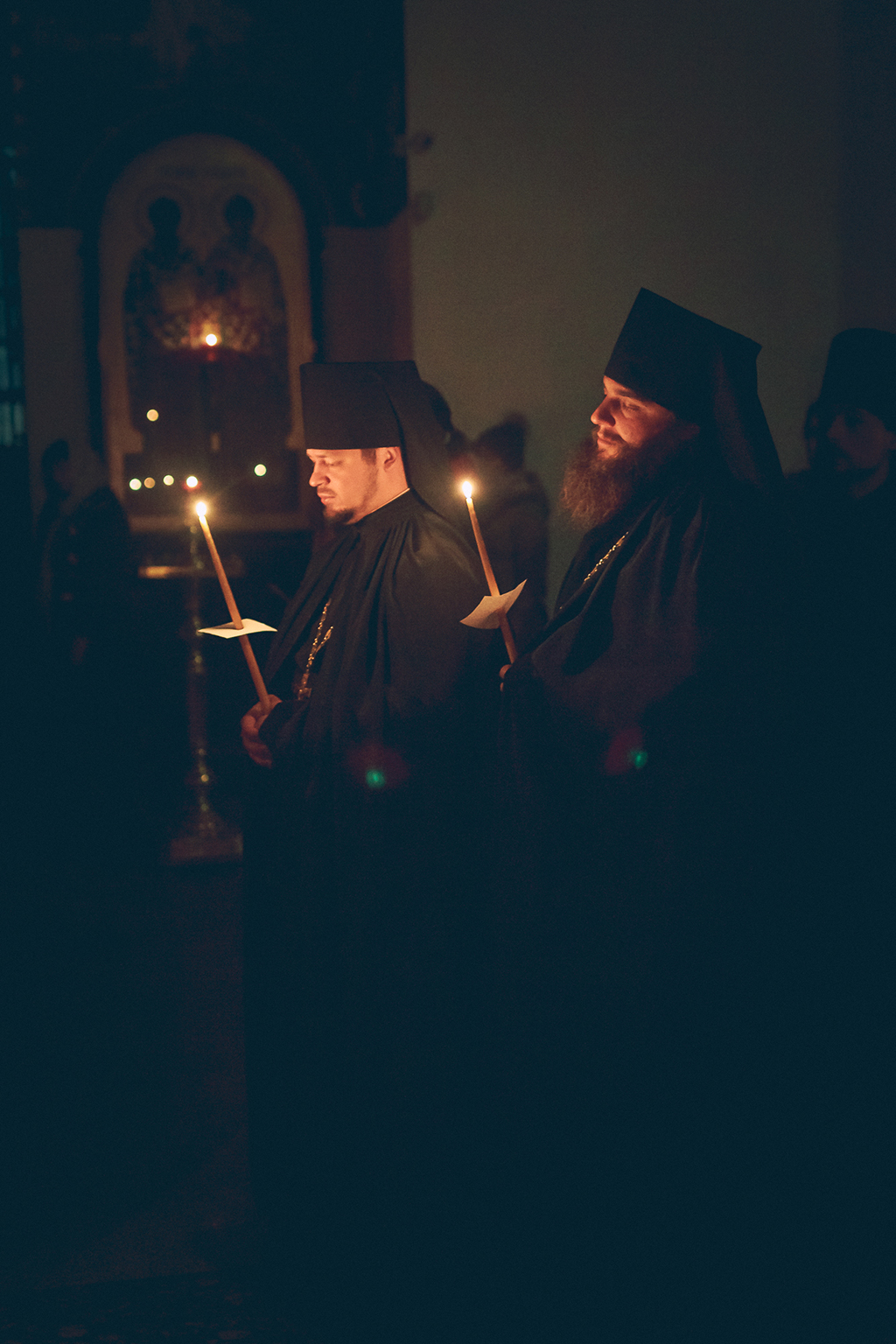 По расстеленной дорожке в храме постригаемый в знак своего смирения и покаяния от западной части, распинаясь, прополз к амвону. Монашеская братия епархии прикрывала постригаемого мантиями, пока тот полз к амвону и потом давал монашеские обеты.