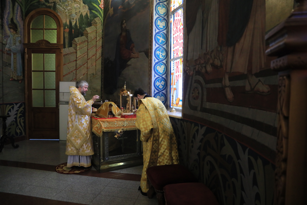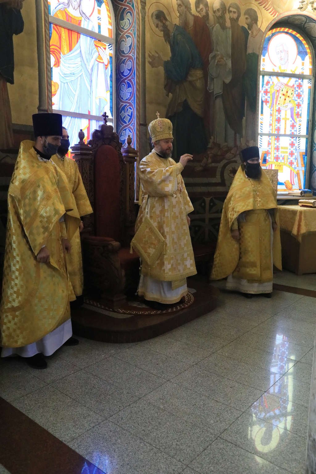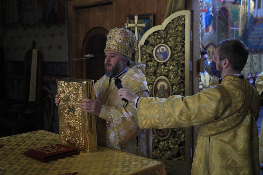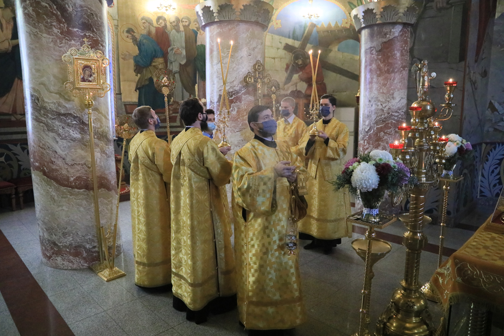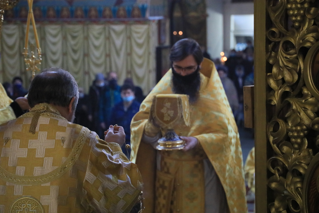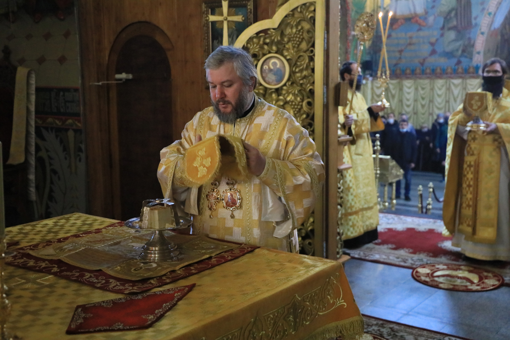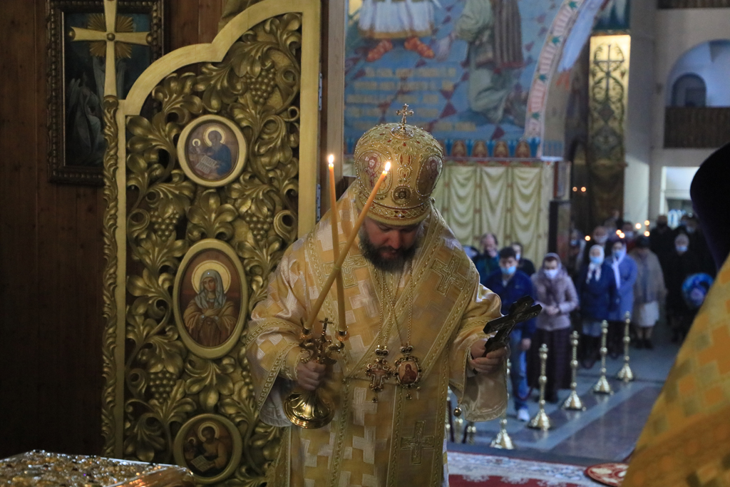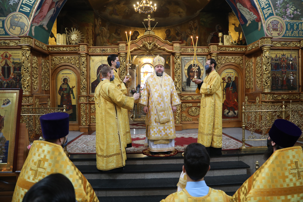 Его Преосвященству сослужили настоятель и духовенство собора: иерей Александр Теличкин, иерей Леонид Зацепилин, диакон Даниил Зырянов и диакон Трофим Осяк.