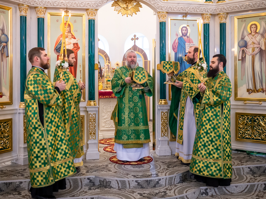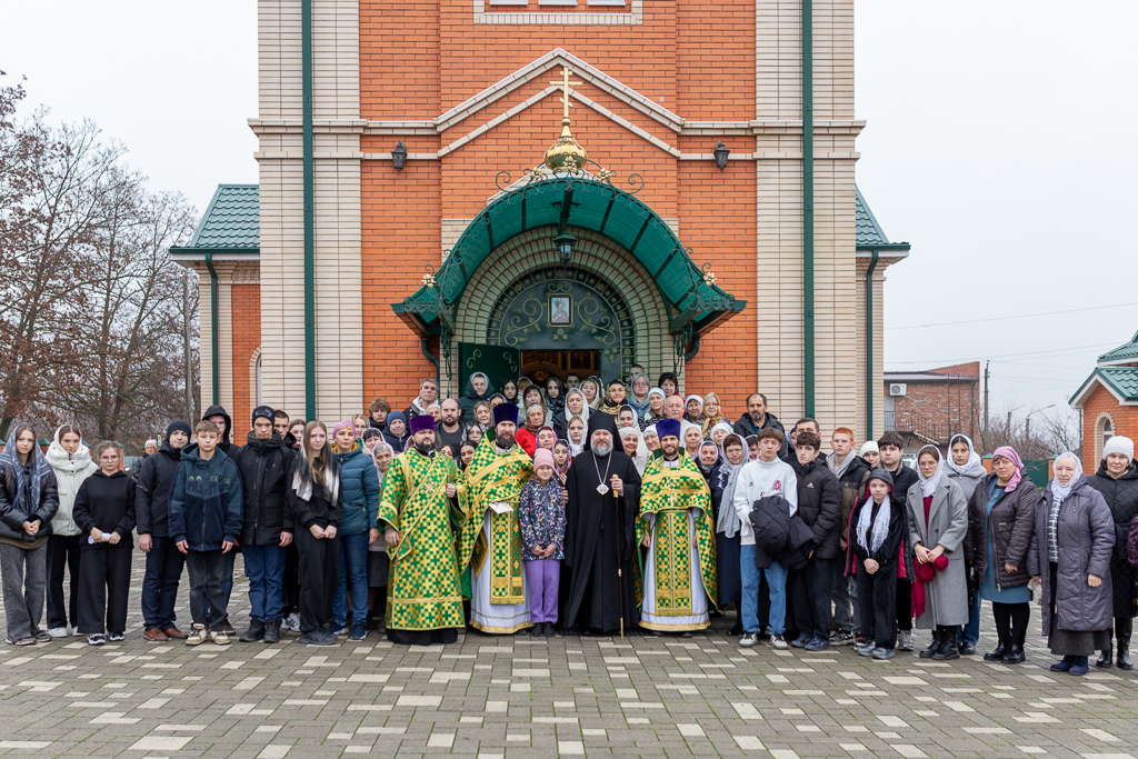 За Божественной литургией архипастырю сослужили настоятель храма иерей Георгий Болоцков, настоятель храма праведного Иосифа Обручника города Шахты иерей Сергий Болоцков и диакон Трофим Осяк.