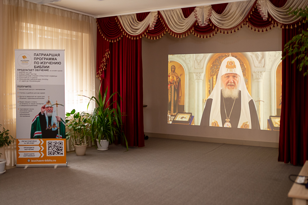 Важным моментом встречи стал просмотр видеобращения Святейшего Патриарха Кирилла, где Предстоятель Церкви поделился методическими рекомендациями по проведению занятий и призвал к активному развитию библейских групп, особенно среди молодежи.