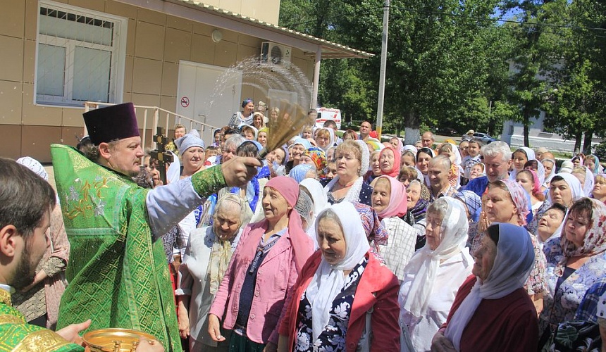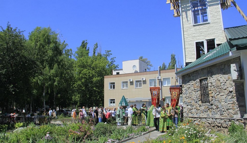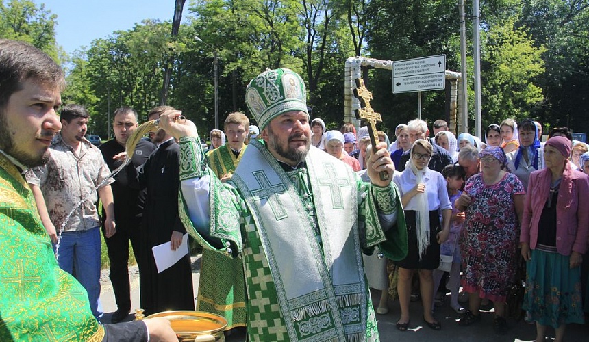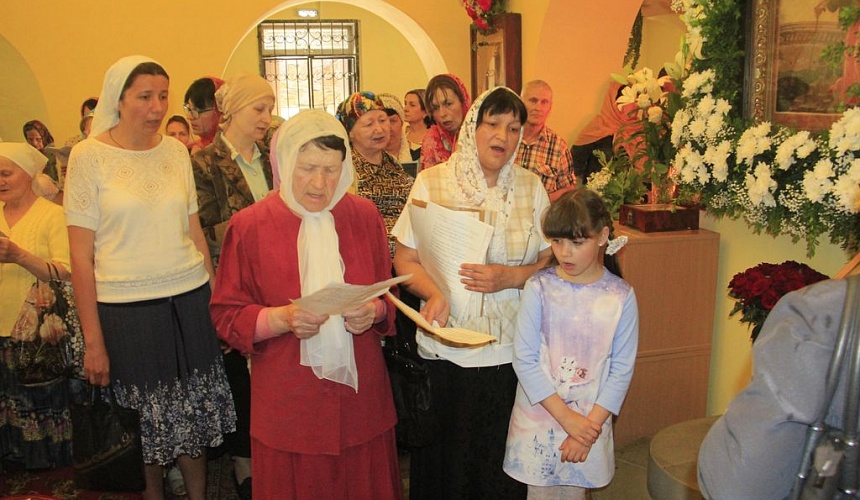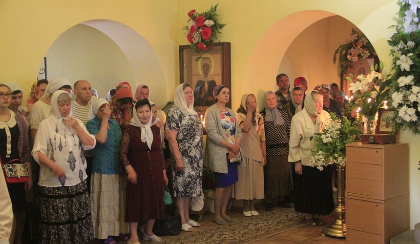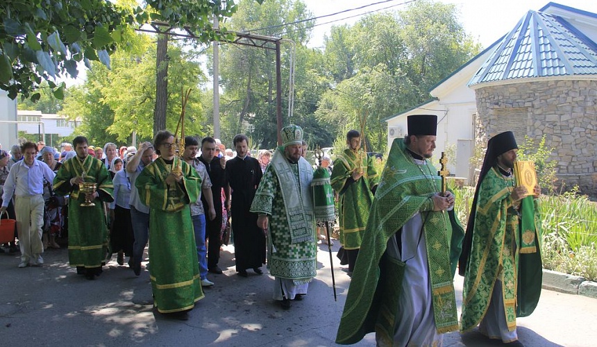 После литургии духовенство и прихожане во главе с архиереем прошли крестным ходом вокруг храма, прославляя блаженную Ксению.