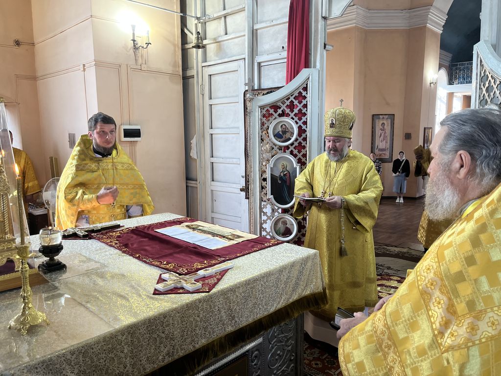 Вместе с архиереем молились благочинный приходов Чернышевского округа иерей Александр Левчик, настоятель храма протоиерей Александр Бралгин, диакон Вячеслав Иващенко и прихожане.