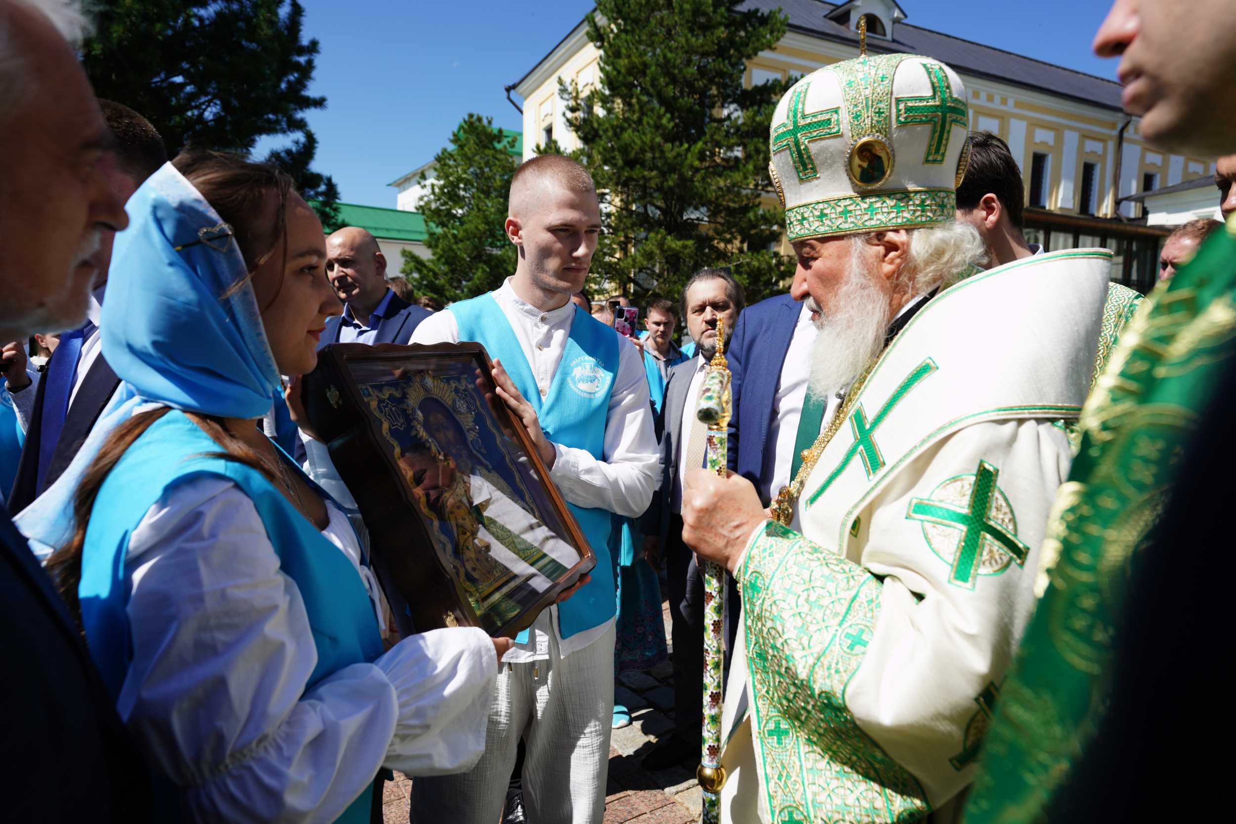 У входа в Патриаршие покои лавры Святейшего Патриарха приветствовали представители Содружества православной молодежи, которые преподнесли в дар Его Святейшеству образ Спасителя.