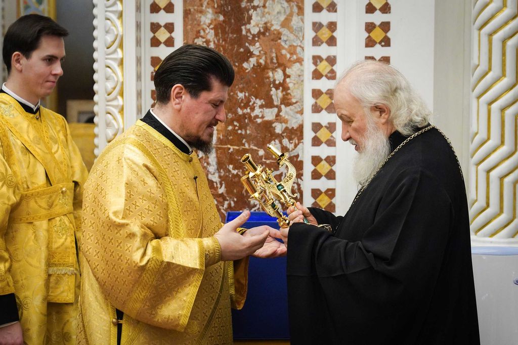 Полномочный представитель Президента РФ в Центральном федеральном округе И.О. Щеголев огласил поздравление Президента России В.В. Путина Предстоятелю Русской Православной Церкви.
