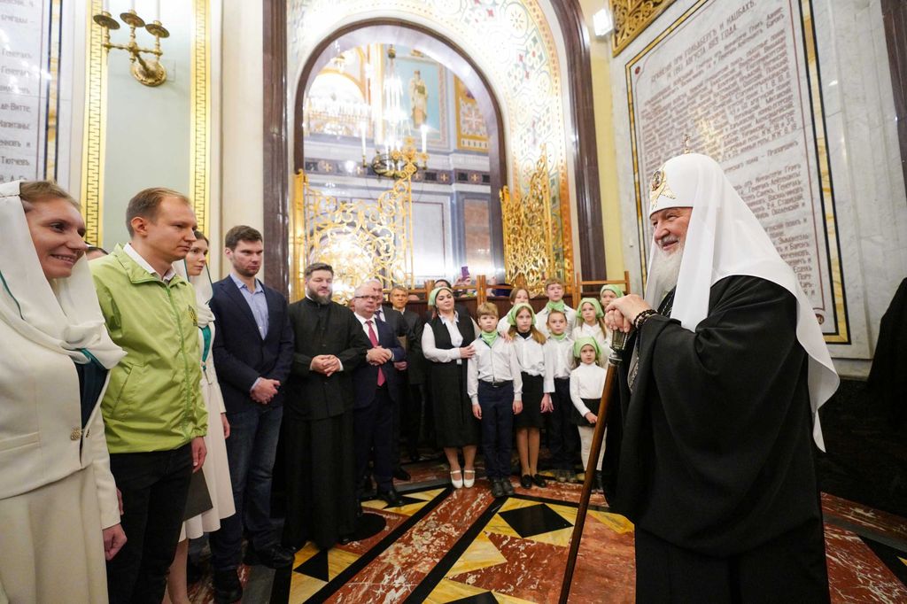 По завершении богослужения в галерее Храма Христа Спасителя Предстоятеля Русской Церкви поздравили руководитель движения «Патриаршие добровольцы» М.Г. Куксов и участники движения.