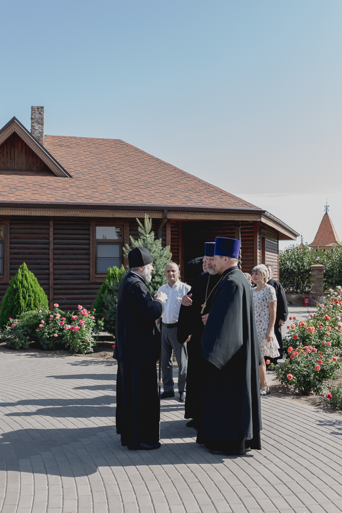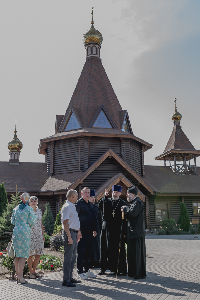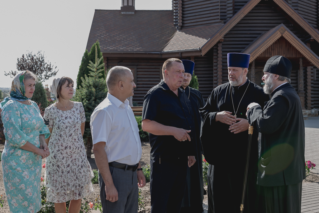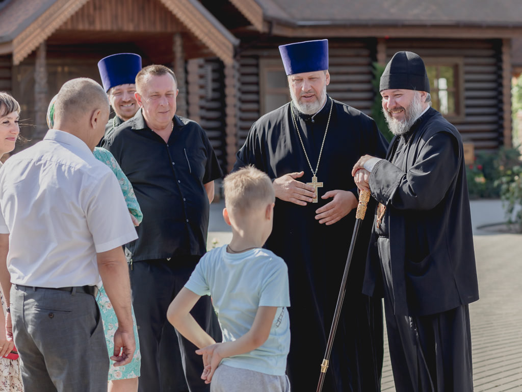 На подворье храма епископа Симона встречали председатель епархиального отдела по церковной благотворительности и социальному служению иерей Владислав Касьянов, создатель парка «Лога» и ктитор храма Сергей Александрович Кушнаренко, директор Центра реабилитации и абилитации «Добродея» Марина Владимировна Важенина, заместитель главы Администрации Каменского района Вадим Васильевич Болдырев, представитель Центра социальной защиты населения города Каменск-Шахтинский Ксения Александровна Ковалёва, настоятель подворья Свято-Троицкой Сергиевой Лавры в городе Пересвет протоиерей Константин Харитонов, клирик храма Покрова Богородицы города Каменск-Шахтинский иерей Владимир Щербаков, представители терапевтической команды Центра и гости из ДНР.