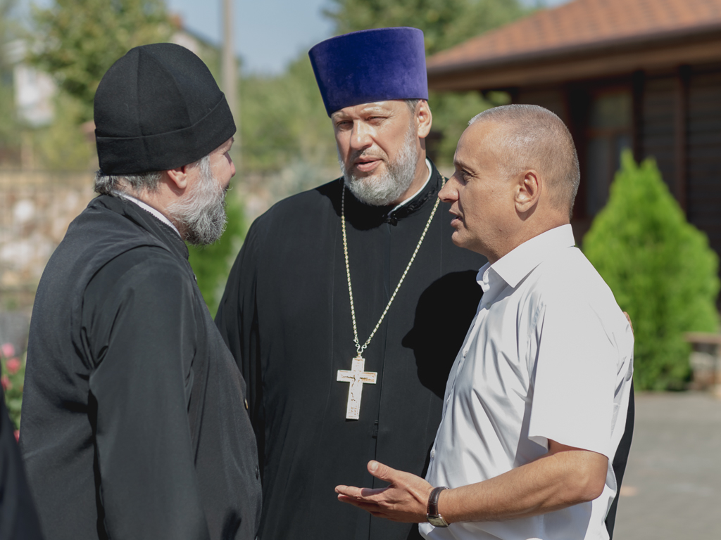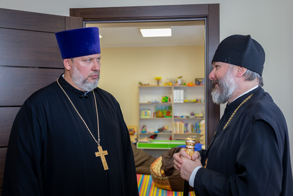 Преосвященнейший епископ Симон, иерей Владислав и Сергей Кушнаренко в ходе встречи обсудили планы развития материальной базы Центра помощи семьям, имеющим детей инвалидов и детей с ОВЗ.