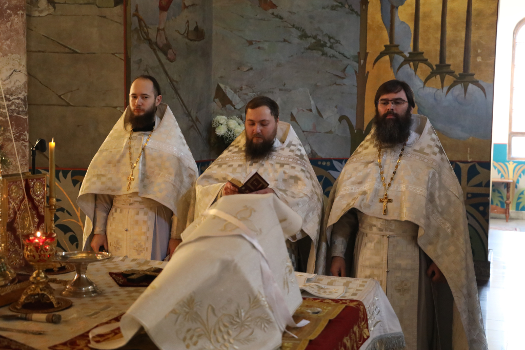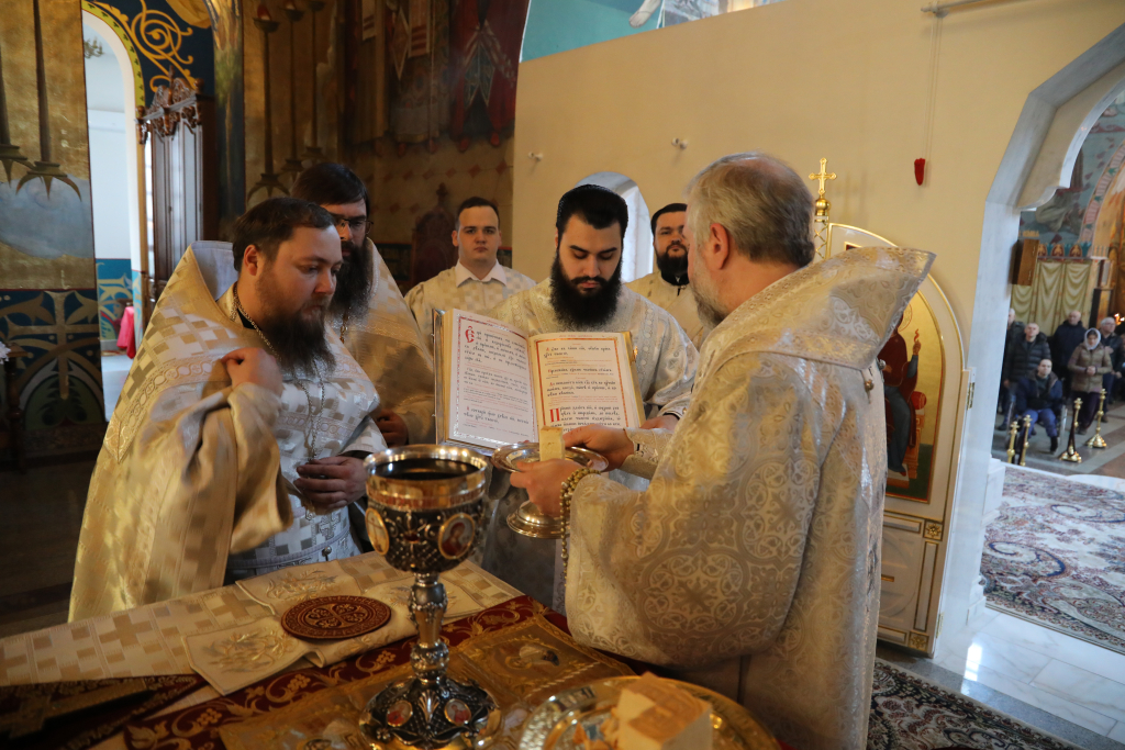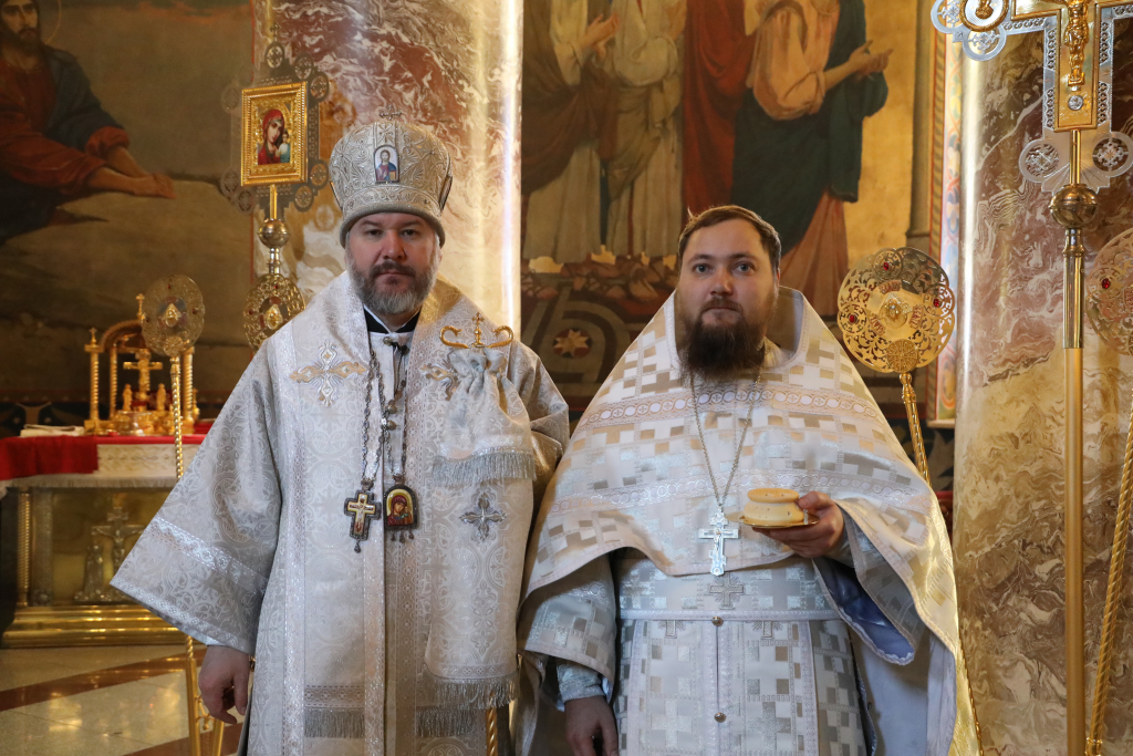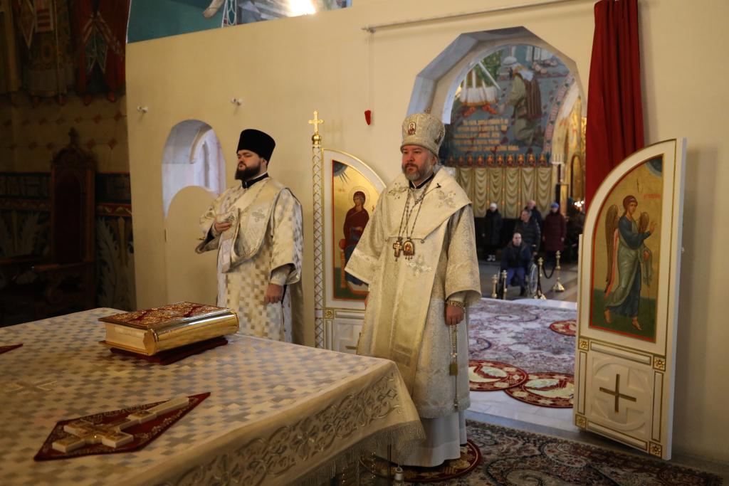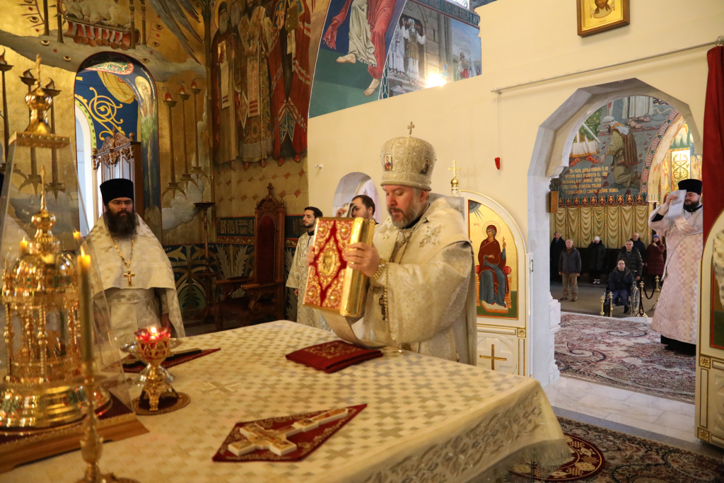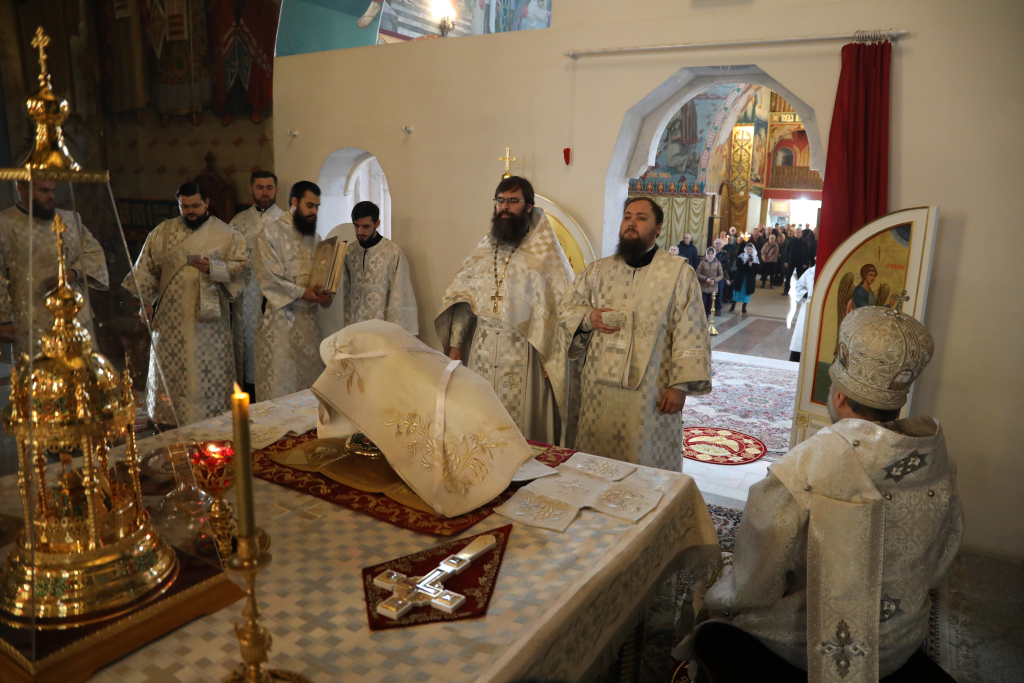 Его Преосвященству сослужили настоятель собора иерей Александр Теличкин, иерей Даниил Зырянов, иерей Олег Брехов, иерей Михаил Дубянский, диакон Трофим Осяк и диакон Никита Осипов.