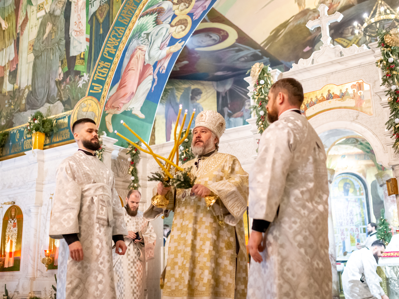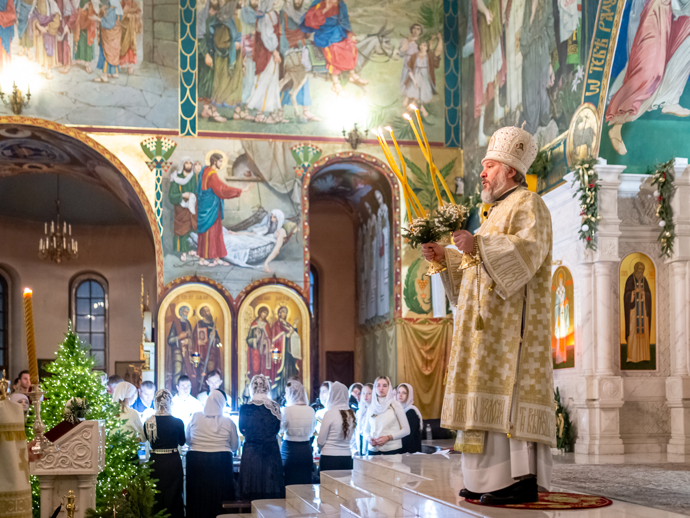Богослужение завершилось славлением перед праздничной иконой Рождества Христова, после чего Преосвященнейший епископ Симон сердечно поздравил духовенство и всех молившихся с праздником.