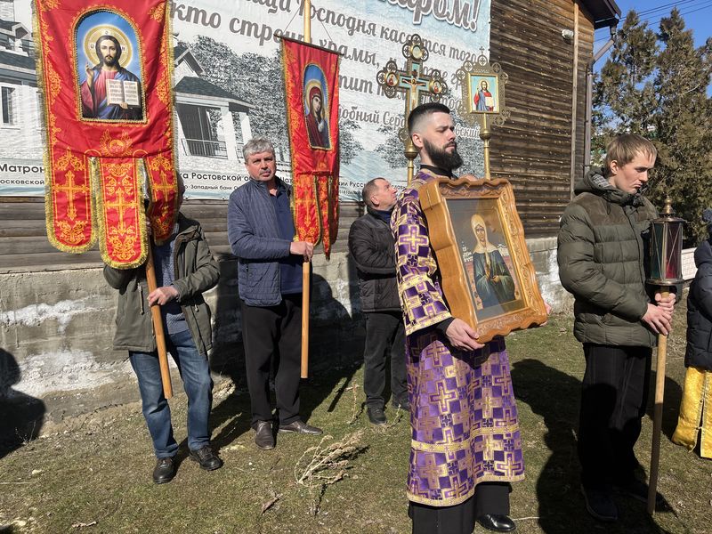 После Литургии все молящиеся совершили крестный ход вокруг храма, прославляя небесную покровительницу прихода блаженную Матрону.