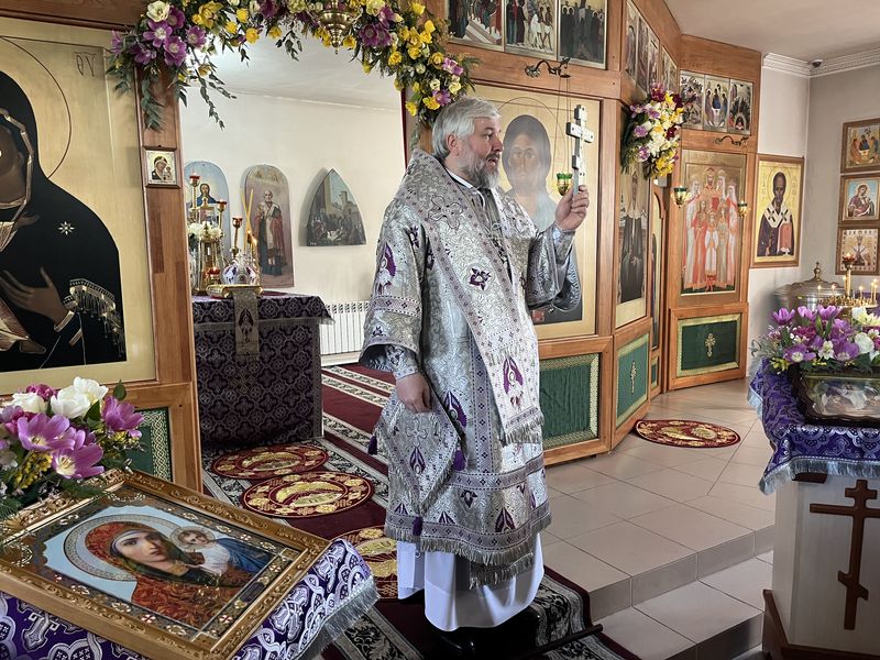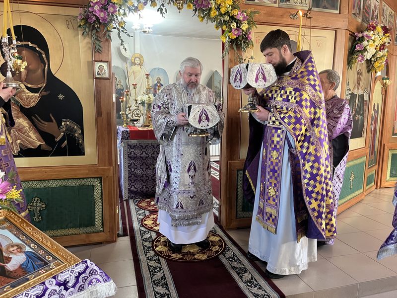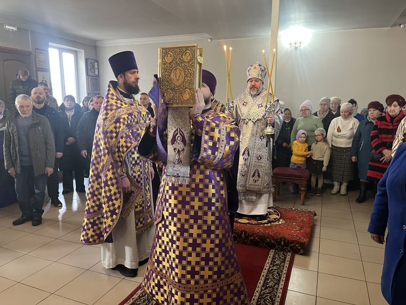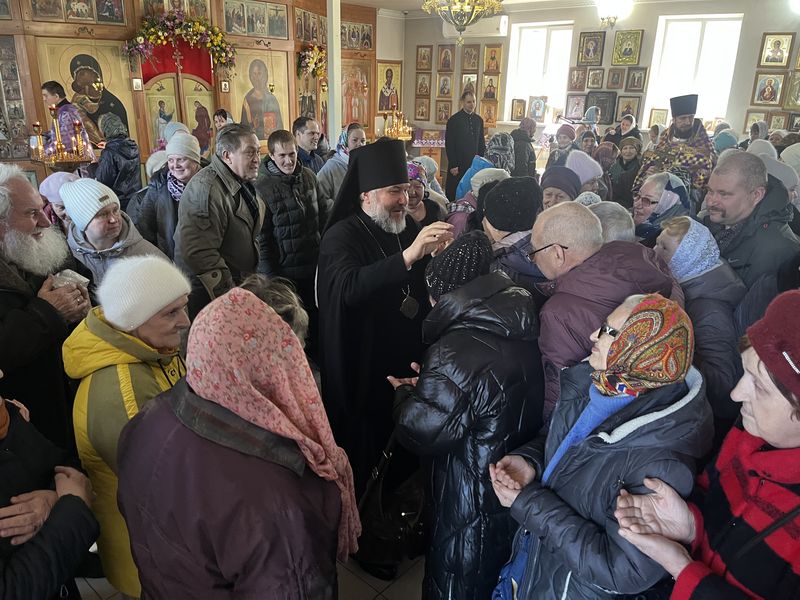 Вместе с архиереем молились настоятель храма протоиерей Александр Барановский, диакон Трофим Осяк и прихожане храма.