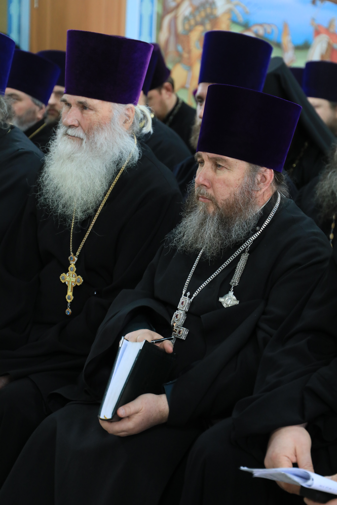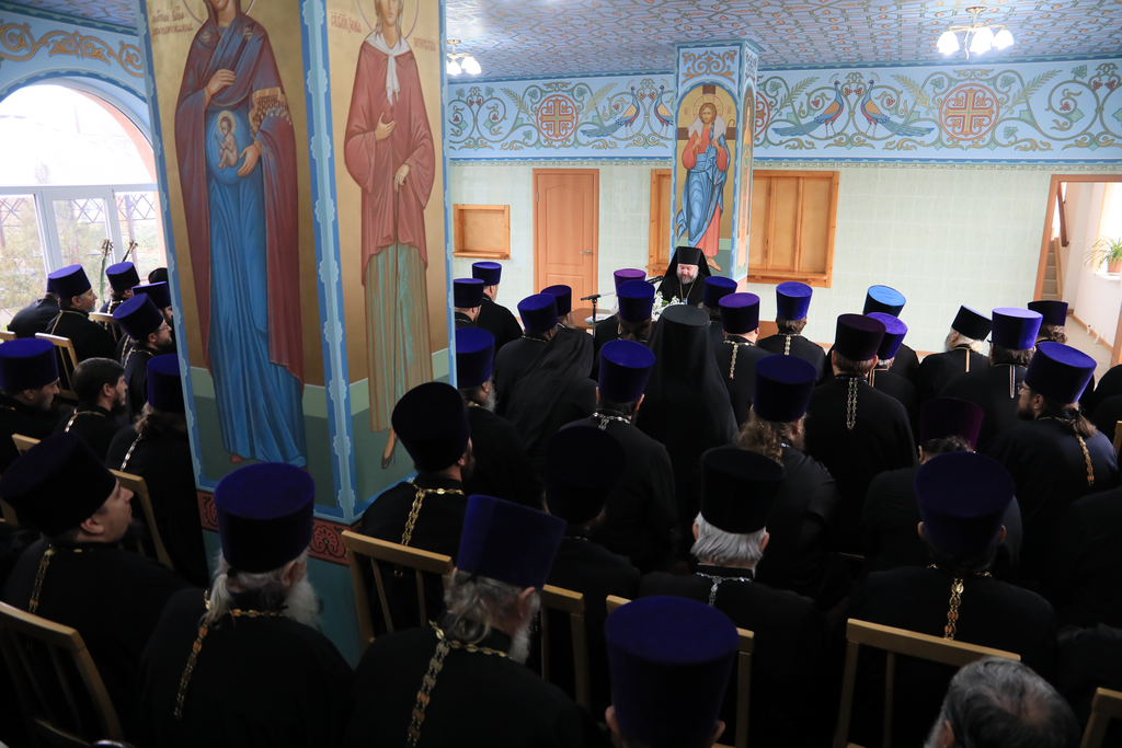Архипастырь приветствовал священнослужителей и в своем докладе, подводя итоги уходящего года, привел статистические данные и отметил наиболее важные события епархиальной жизни.