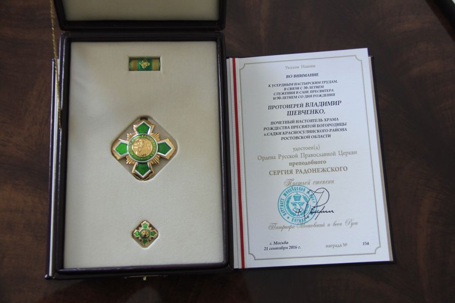 Указом Святейшего Патриарха Московского и всея Руси Кирилла во внимание к усердным пастырским трудам, в связи с 30-летием служения в сане и 90-летием со дня рождения, Преосвященнейший епископ Симон наградил почетного настоятеля храма Рождества Пресвятой Богородицы х. Садки протоиерея Владимира Шевченко Орденом Русской Православной Церкви преподобного Сергия Радонежского III степени.