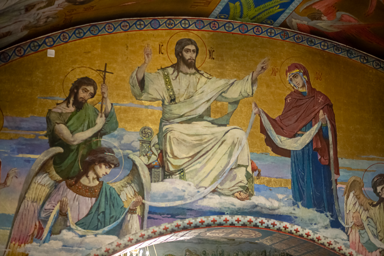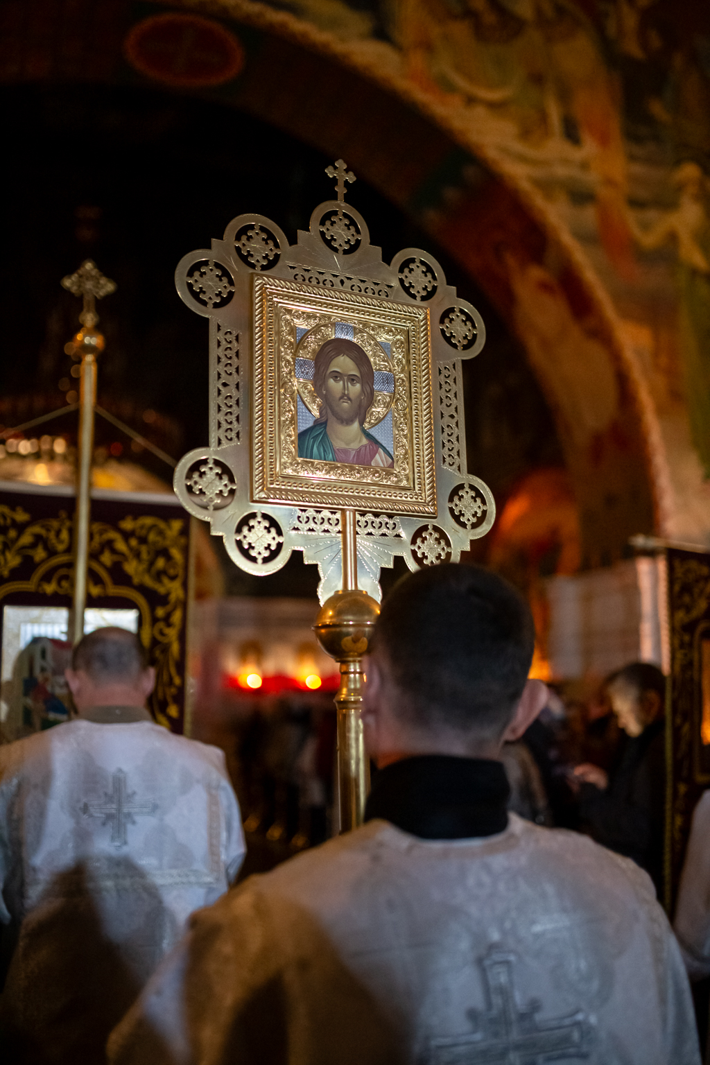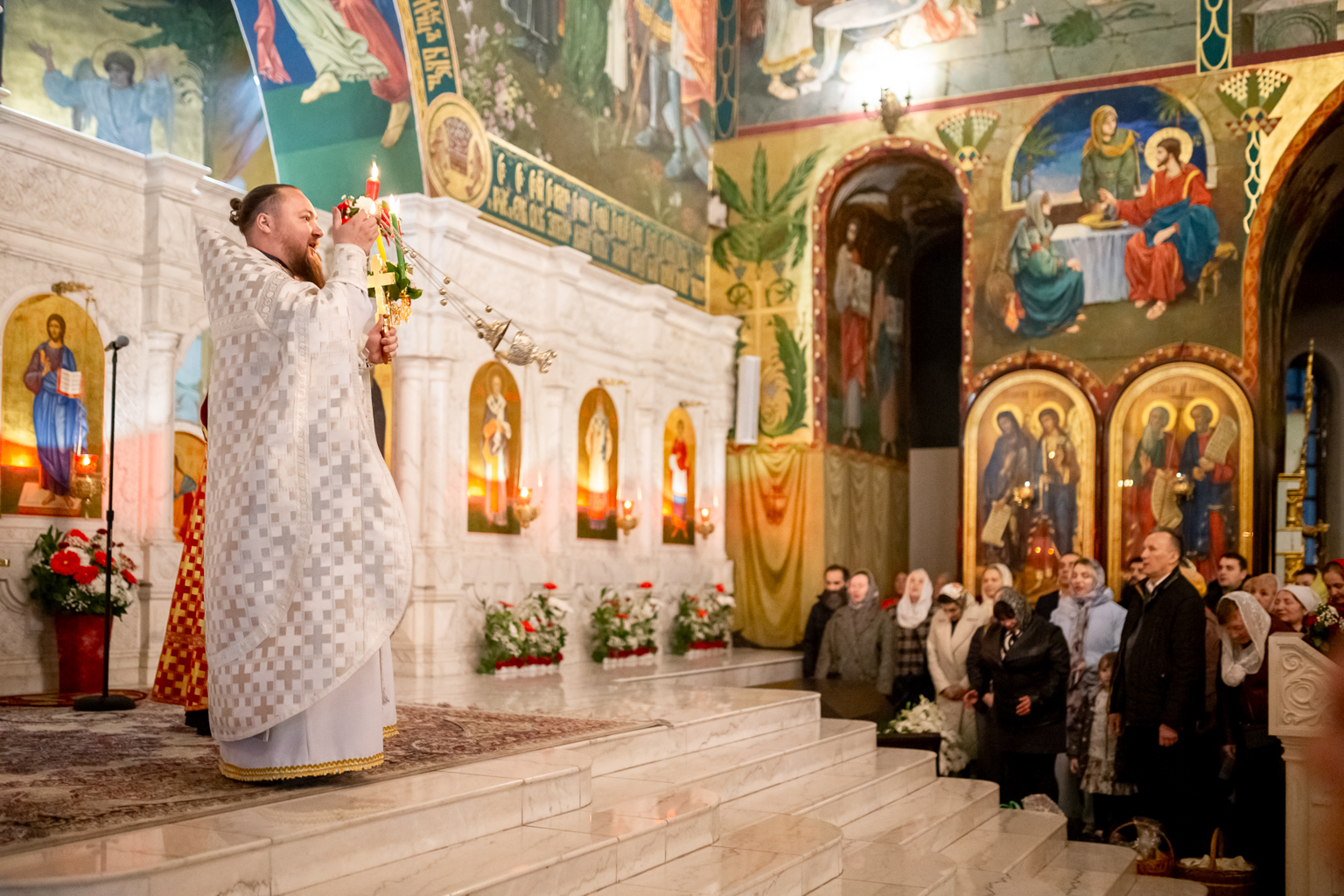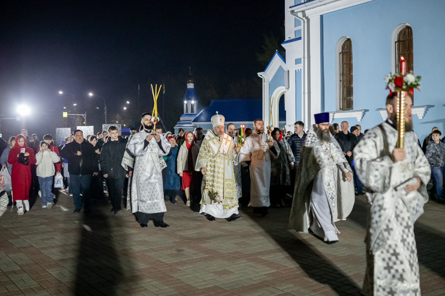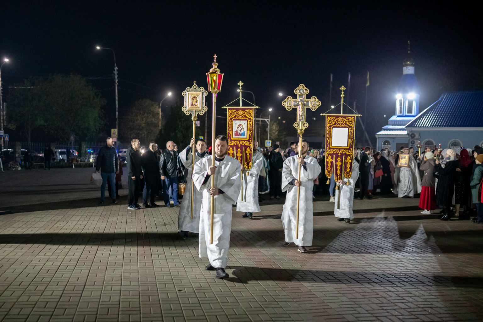 Священнослужители с крестом, святыми образами и светильниками исходят из алтаря и вместе с народом обходят вокруг собора с пением «Воскресение Твое, Христе Спасе, Ангели поют на небесех, и нас на земли сподоби чистым сердцем Тебе славити». Шествие останавливается у затворенных врат храма, и здесь впервые архиерей возглашает: «Христос воскресе из мертвых, смертию смерть поправ, и сущим во гробех живот даровав», перевод «Христос воскрес из мёртвых, смертью смерть победив, и находящимся во гробах (умершим), жизнь даровав».