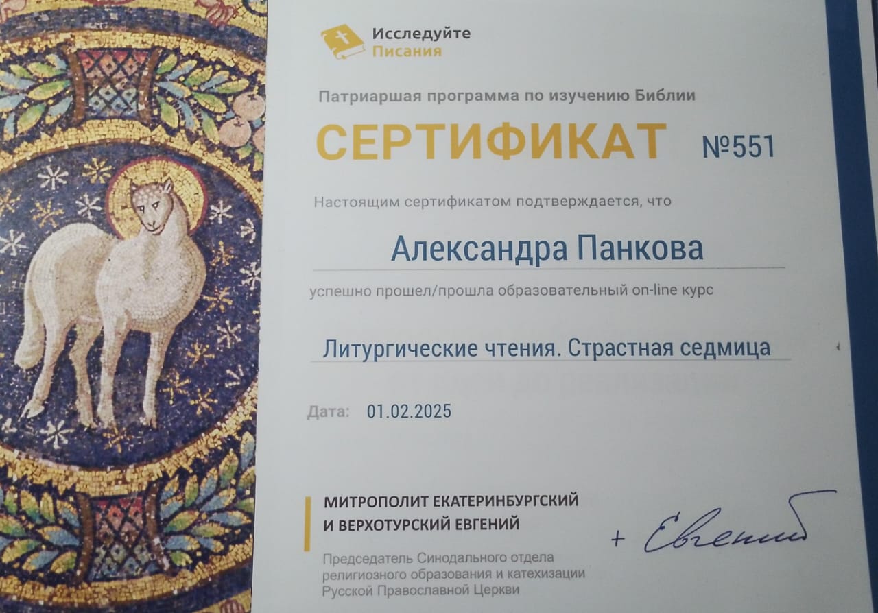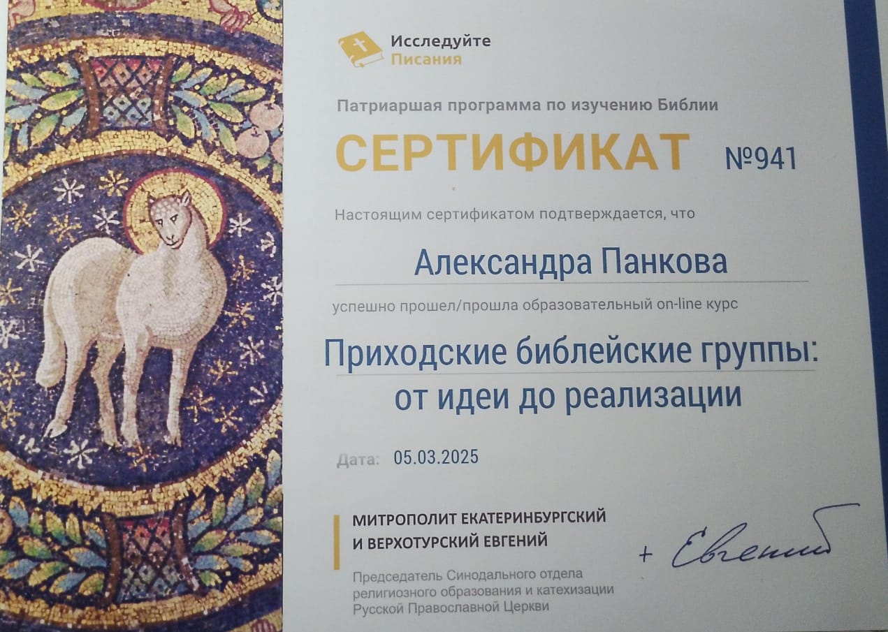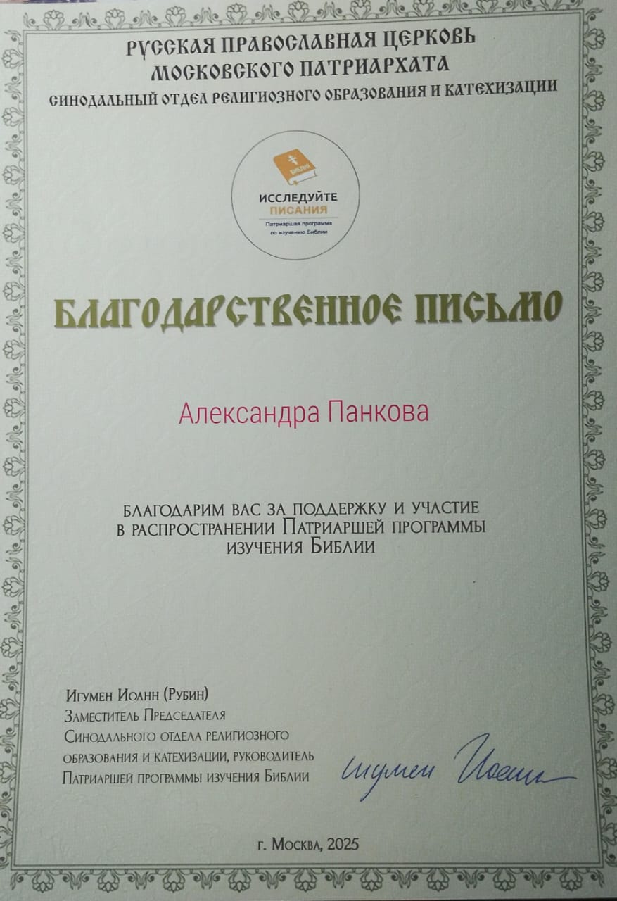 По благословению протоиерея Романа Амплеева, настоятеля храма в честь Донской иконы Божией Матери, благочинного приходов Новошахтинского округа, председателя отдела по взаимоотношениям Церкви с обществом Шахтинской епархии, руководитель приходской библейской группы храма Свт. Николая Чудотворца Панкова Александра Николаевна окончила три курса в рамках патриаршей программы и получила благодарственное письмо за их успешное прохождение.