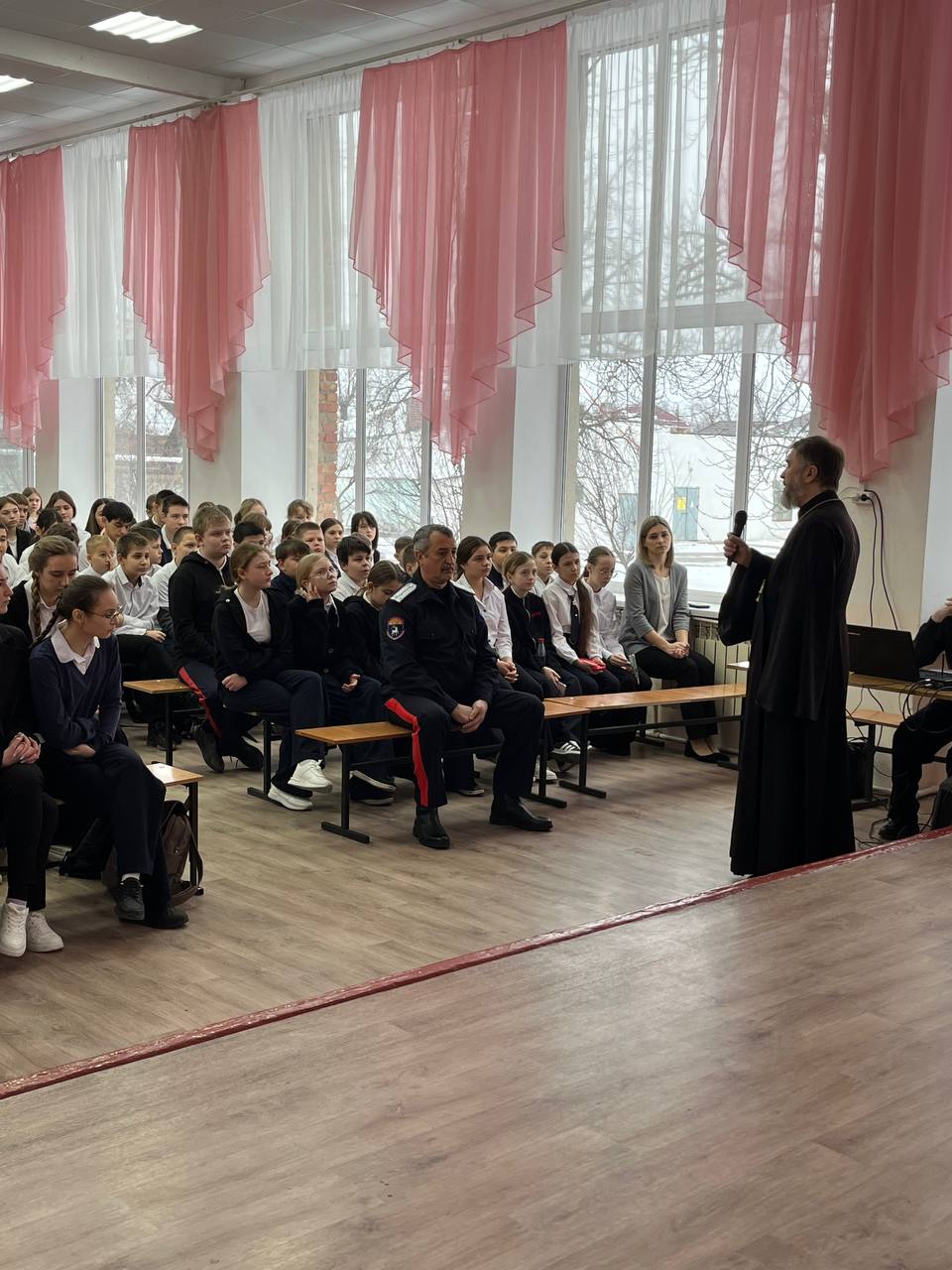 Обращаясь к слушателям, протоиерей Александр рассказал о мужестве казаков, их верности Богу, подчеркнув, что во время Великой Отечественной войны казаки одними из первых поднялись на защиту Родины, проявляя героизм. Священник пожелал казачьей молодёжи быть верными заветам предков, хранить их память, приумножать былую славу своими стараниями и стремлением жить по казачьим устоям и правилам веры.