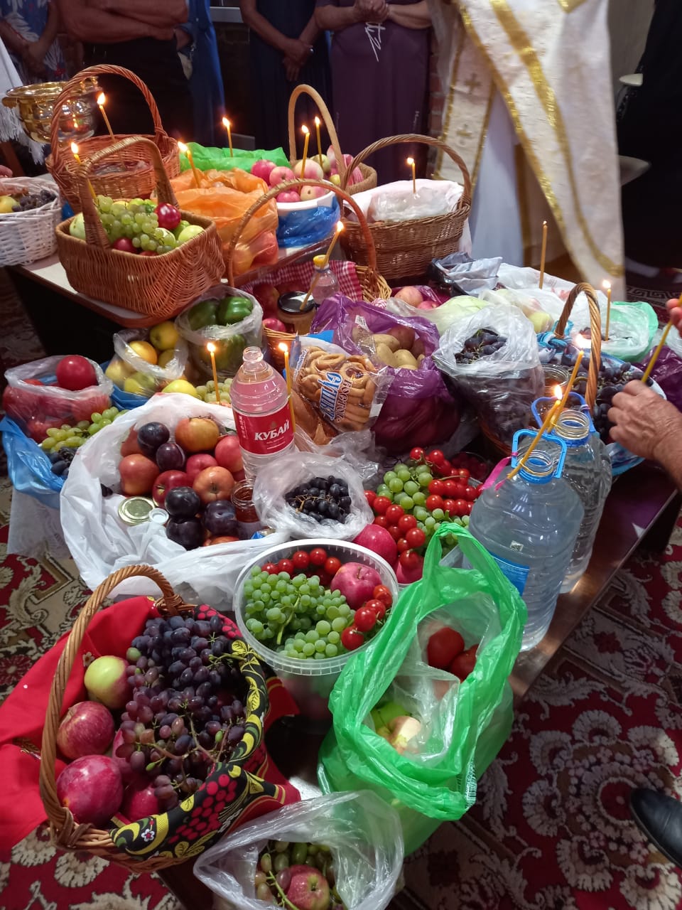 В завершение богослужения был проведен водосвятный молебен с освящением фруктовых плодов и меда. За словом проповеди протоиерей Игорь поздравил всех молящихся с праздником, пожелав многая и благая лета.