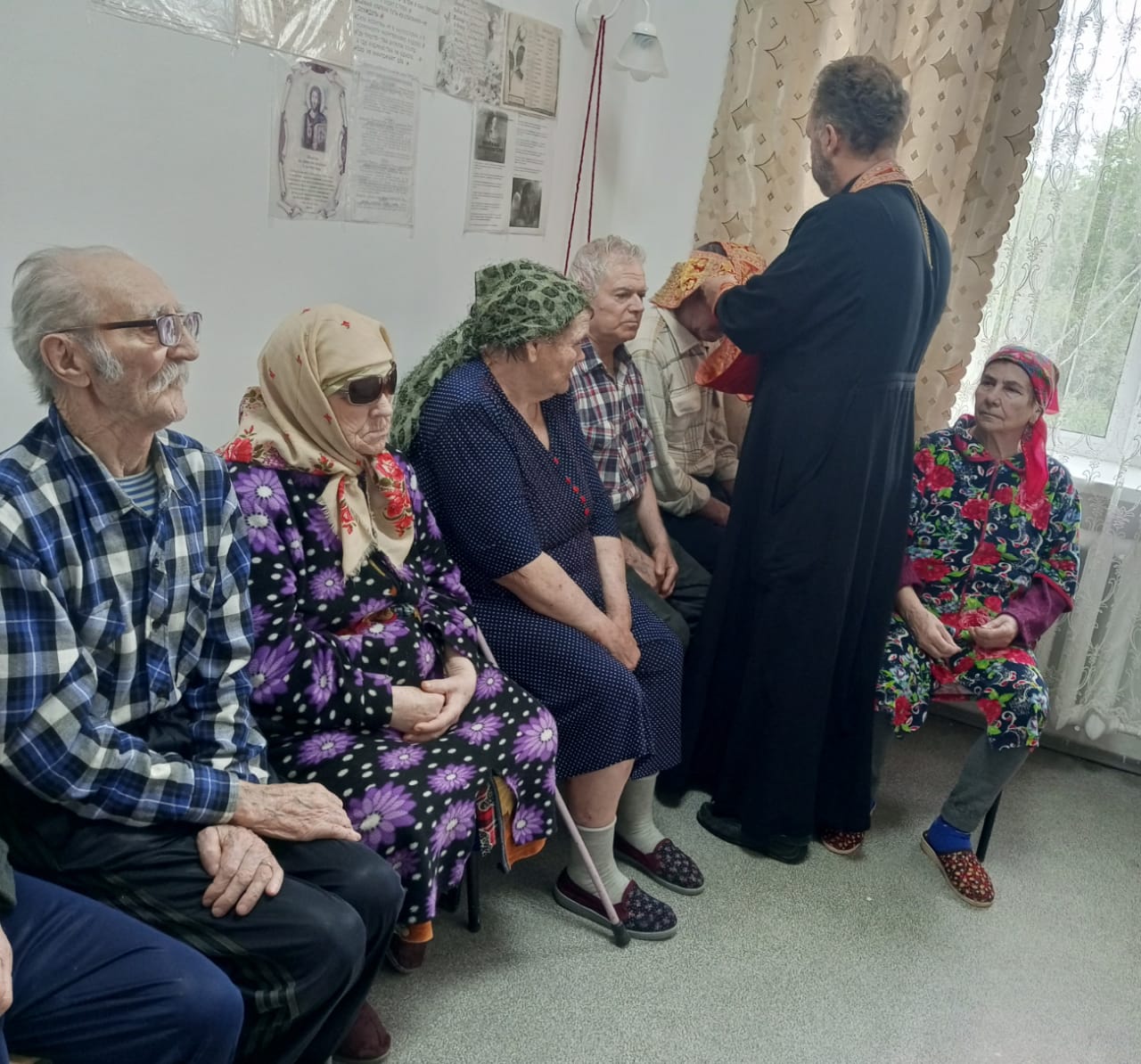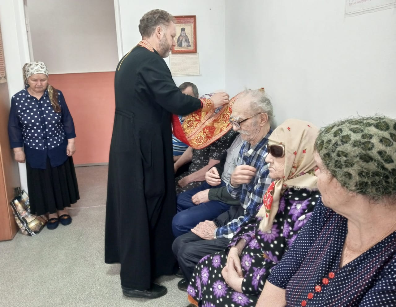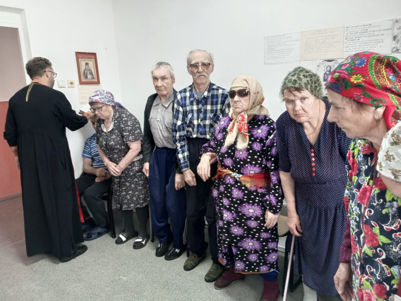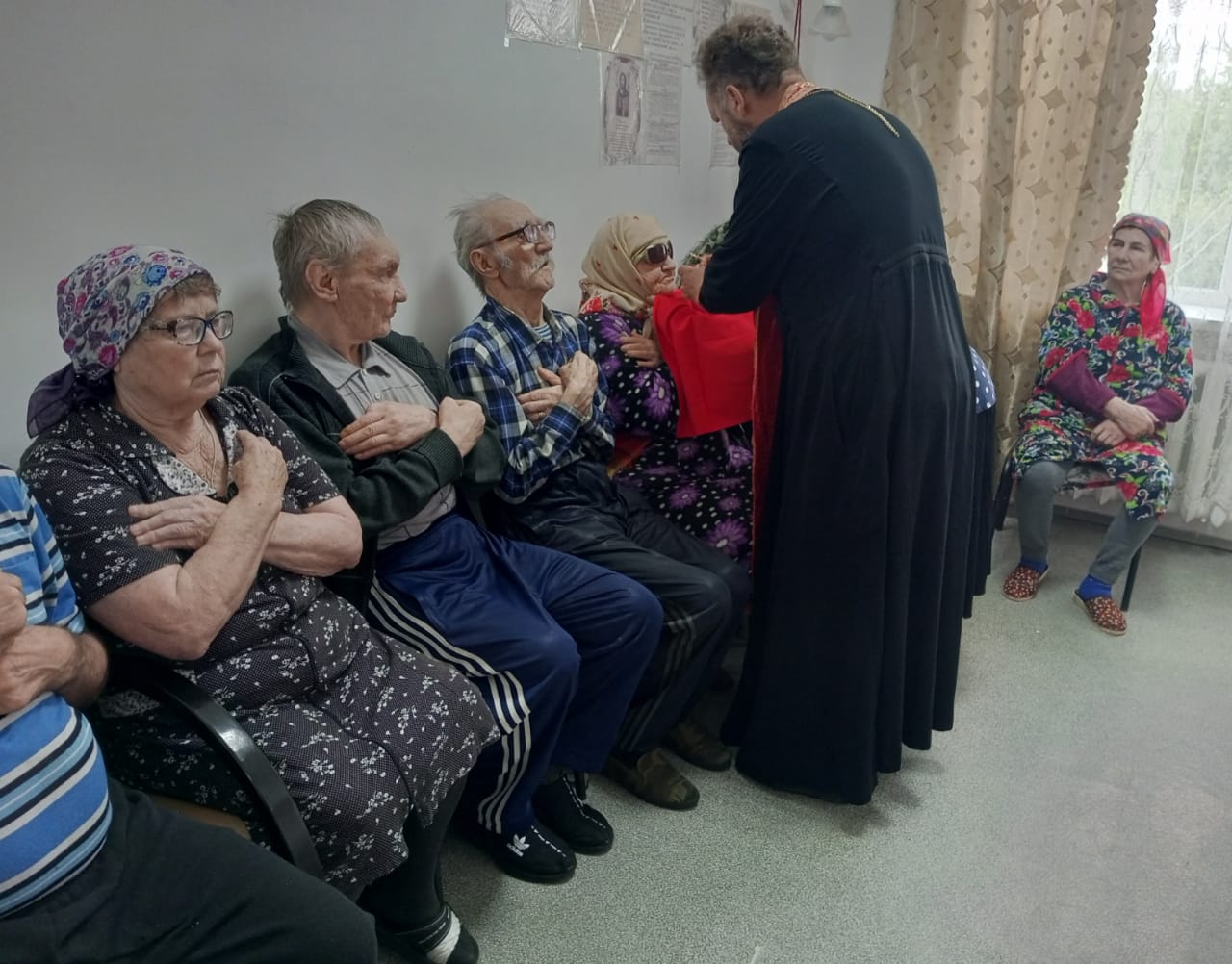 Священник совершил таинства Исповеди и Причастия, помолился о здравии постояльцев и работников учреждения, а затем провёл беседу на тему «Преполовение Пятидесятницы».
