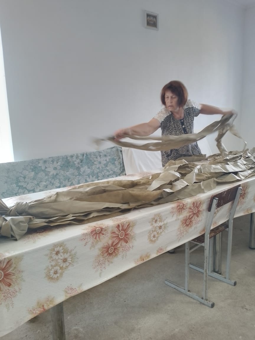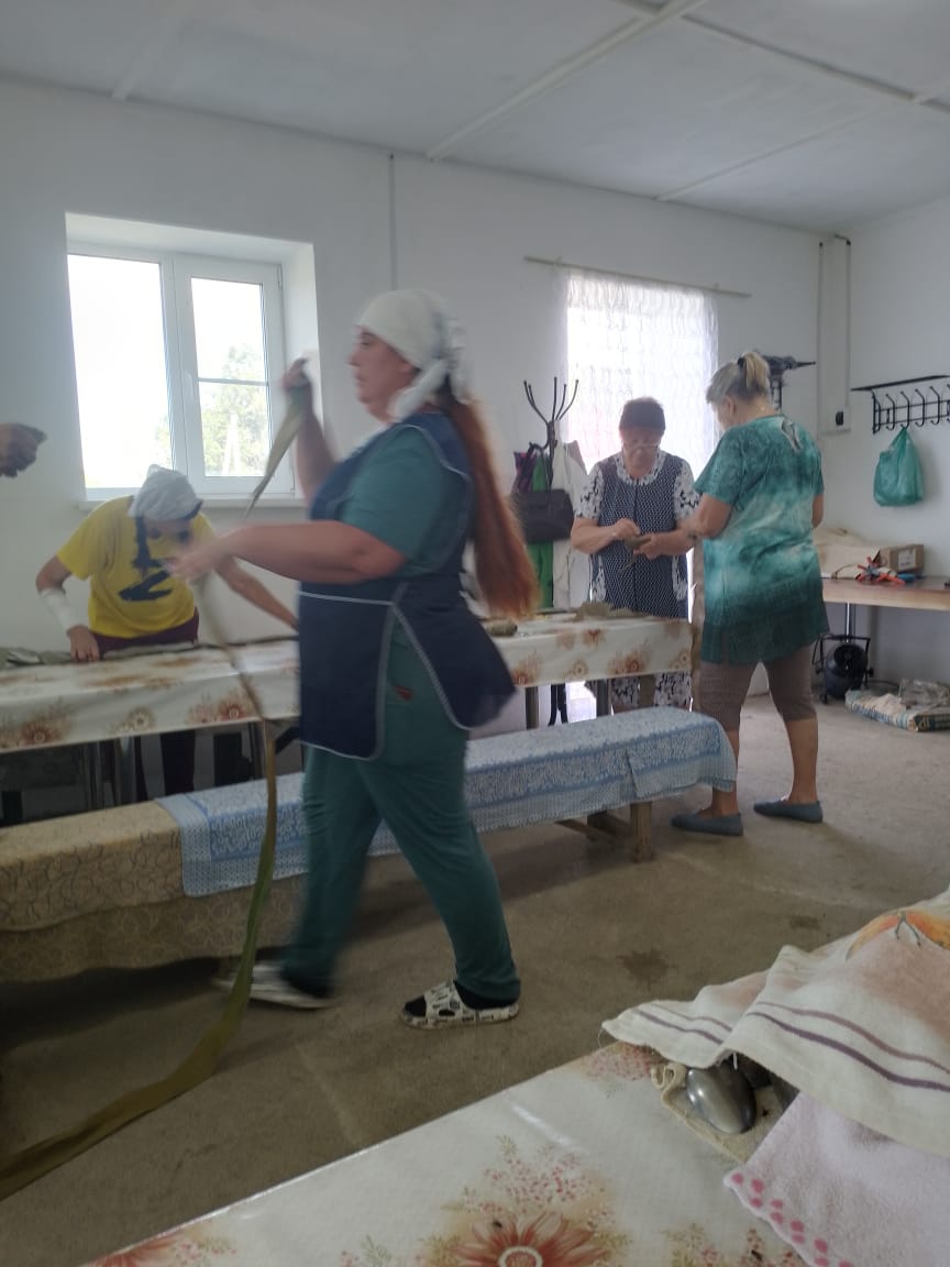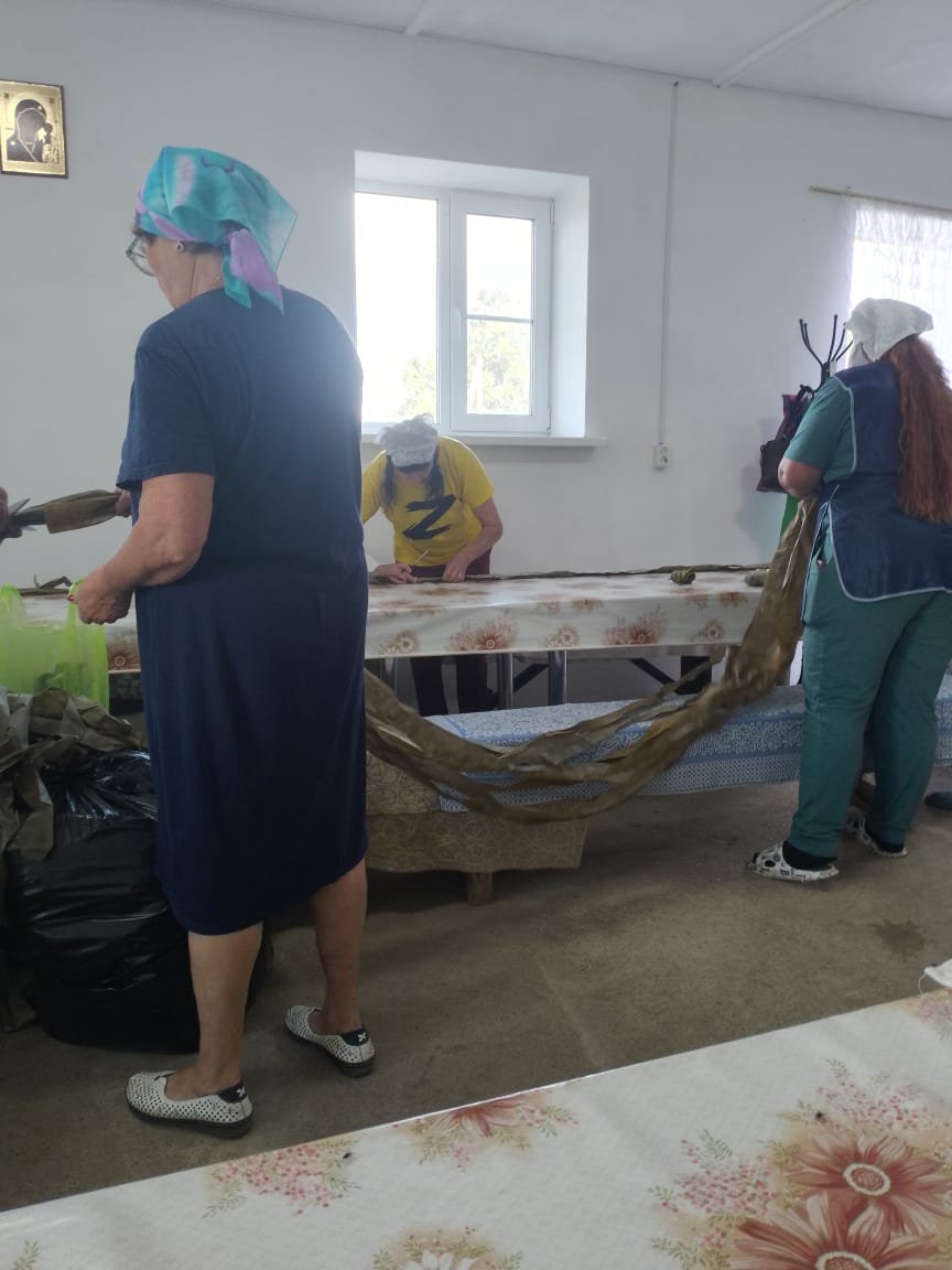 В Трапезной Храма Архистратига Божия Михаила с. Первомайского Кашарского района прихожанами храма были подготовлены ленты для маскировочно-защитных сетей в зону СВО.