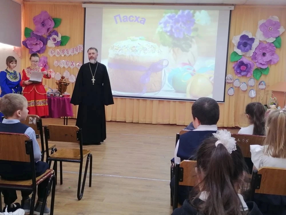 В дни Светлой Седмицы в казачьей средней школе №2 прошла встреча учащихся 2-3 и 6-7 классов с духовником школы, настоятелем храма Святителя Николая, протоиереем Александром Маштановым.