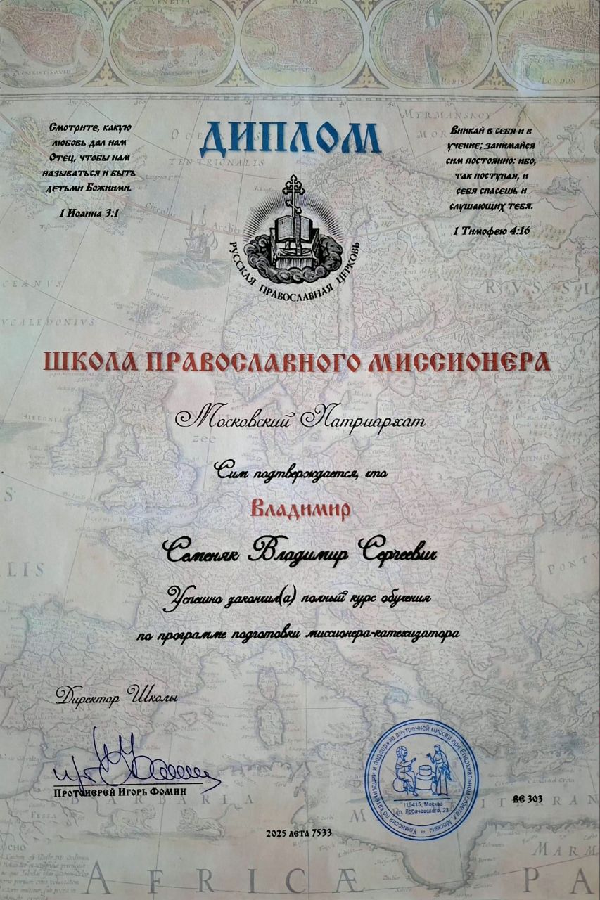 Помощник благочинного приходов Каменского и Каменск-Шахтинского церковных округов Владимир Семеняк успешно закончил обучение в Школе православного миссионера.