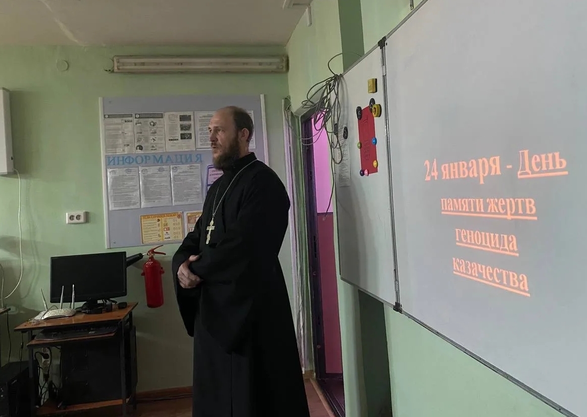 В казачьей средней школе хутора Красный Багаевского района прошел «Урок Памяти», приуроченный к 107-й годовщине геноцида казачьего народа. На занятии присутствовал настоятель храма апостола Иоанна Богослова х. Красный иерей Андрей Перьков.