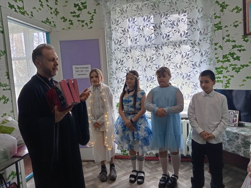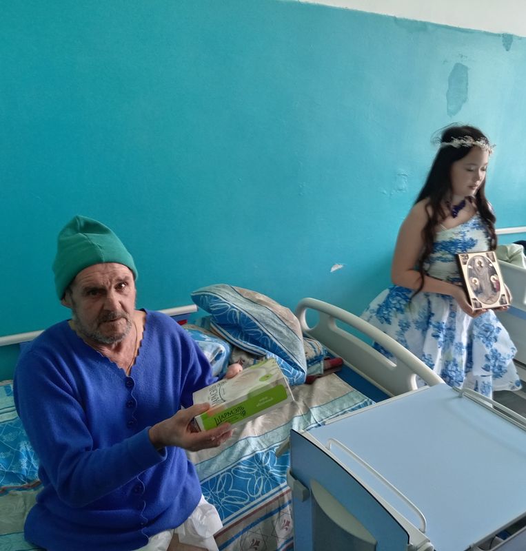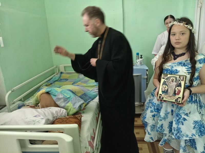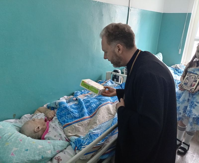После концерта протоиерей Роман ещё раз поздравил всех присутствующих с праздником Пасхи, пожелал здравия телесного и духовного, терпения и сострадания. Затем вместе с детьми он вручил пасхальные гостинцы пациентам. Священник и школьники прошли по палатам, поздравляя каждого пасхальным тропарём и вручая угощения.