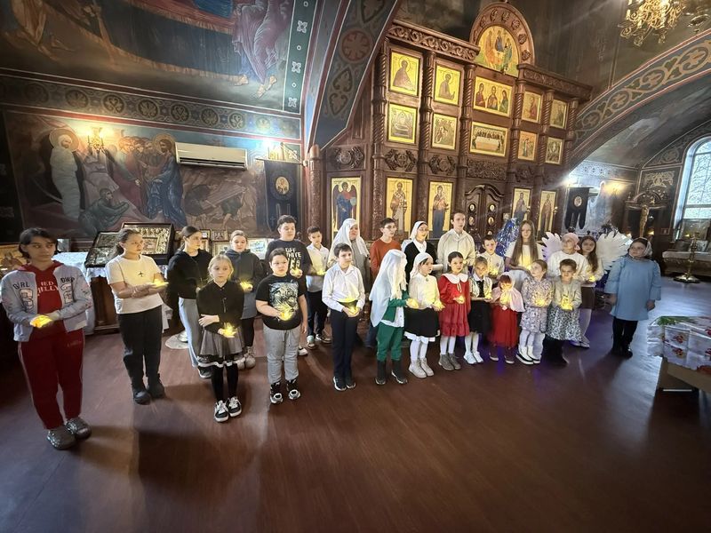 Преподаватель группы Хомутова Н.И. сказала вступительное слово. Воспитанники учебно-воскресной группы встретили гостей в нарядных костюмах праздничной постановкой. Песнопения и сценка покорили зрителей. Дети и родители делали памятные фотоснимки перед елкой и рождественским вертепом, который сделали преподаватели воскресной школы Миронова Ю.Ю. и Жукова Л.И.