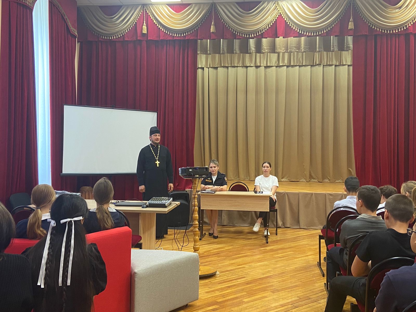 На встрече присутствовали настоятель храма Иоанна Предтечи в ст. Боковской иерей Александр Левчик, инспектор ПДН ОП (дислокация ст. Боковская) МО МВД РФ «Кашарский» Татьяна Владимировна Ситникова, методист МБУ «РМК» Боковского района И.В. Вислогузова, учащиеся и педагоги школы.