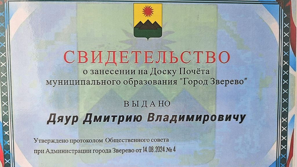 В городе Зверево состоялось торжественное открытие Доски Почёта, на которой увековечены имена людей, внесших значительный вклад в развитие города. Среди удостоенных этой чести оказался благочинный Зверево-Никольского округа иерей Димитрий Дяур. Это решение было утверждено протоколом общественного совета при администрации города.