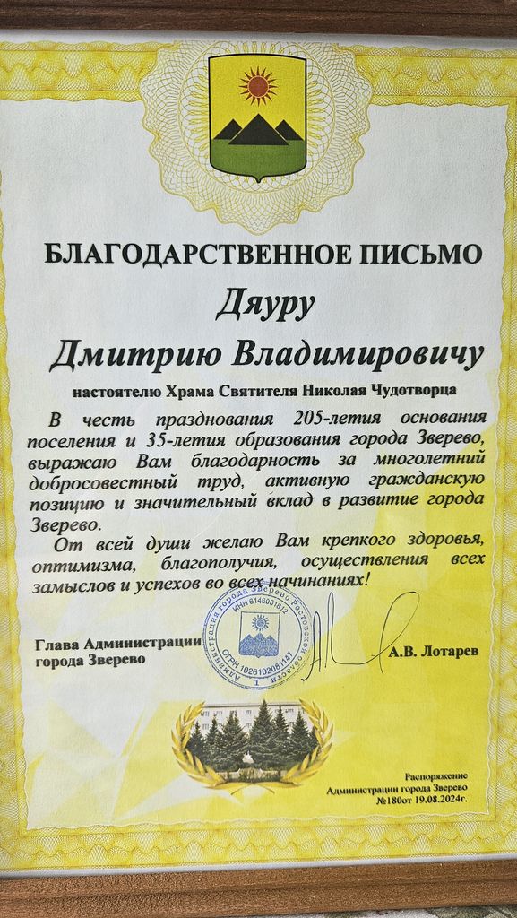 Также отец Димитрий был награжден благодарственным письмом в честь празднования 205-летия основания поселения и 35-летия образования города Зверево. Награда стала признанием его многолетнего добросовестного труда, активной гражданской позиции и значительного вклада в развитие города.
