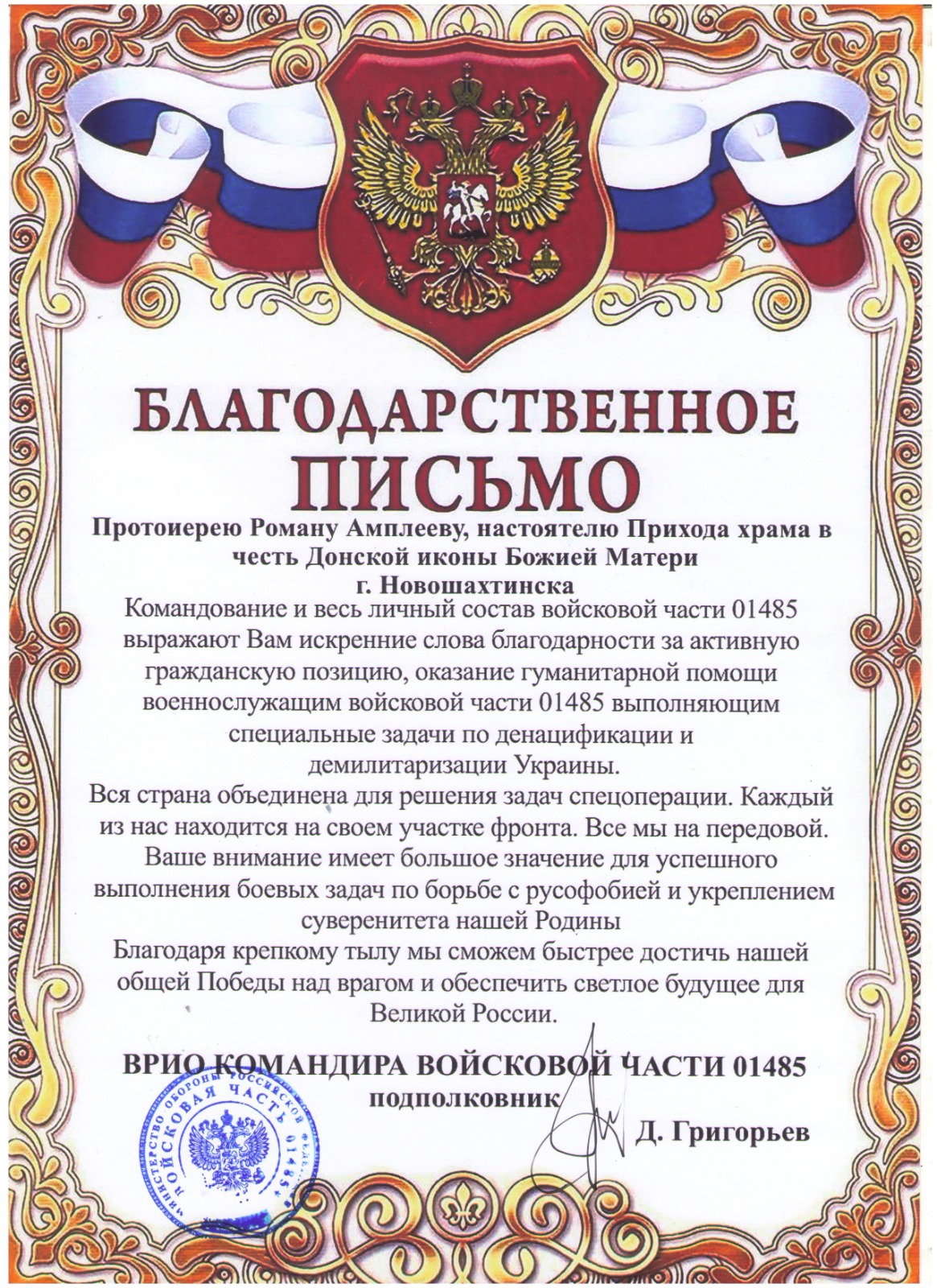 Благодарственным письмом от командования и личного состава войсковой части № 01485 в лице ВРИО командира войсковой части подполковника Д. Григорьева, награжден протоиерей Роман Амплеев – настоятель храма в честь Донской иконы Божией Матери, благочинный приходов Новошахтинского округа, председатель епархиального отдела по взаимоотношениям Церкви с обществом за активную ежемесячную гуманитарную помощь воинам на протяжении Специальной Военной операции.