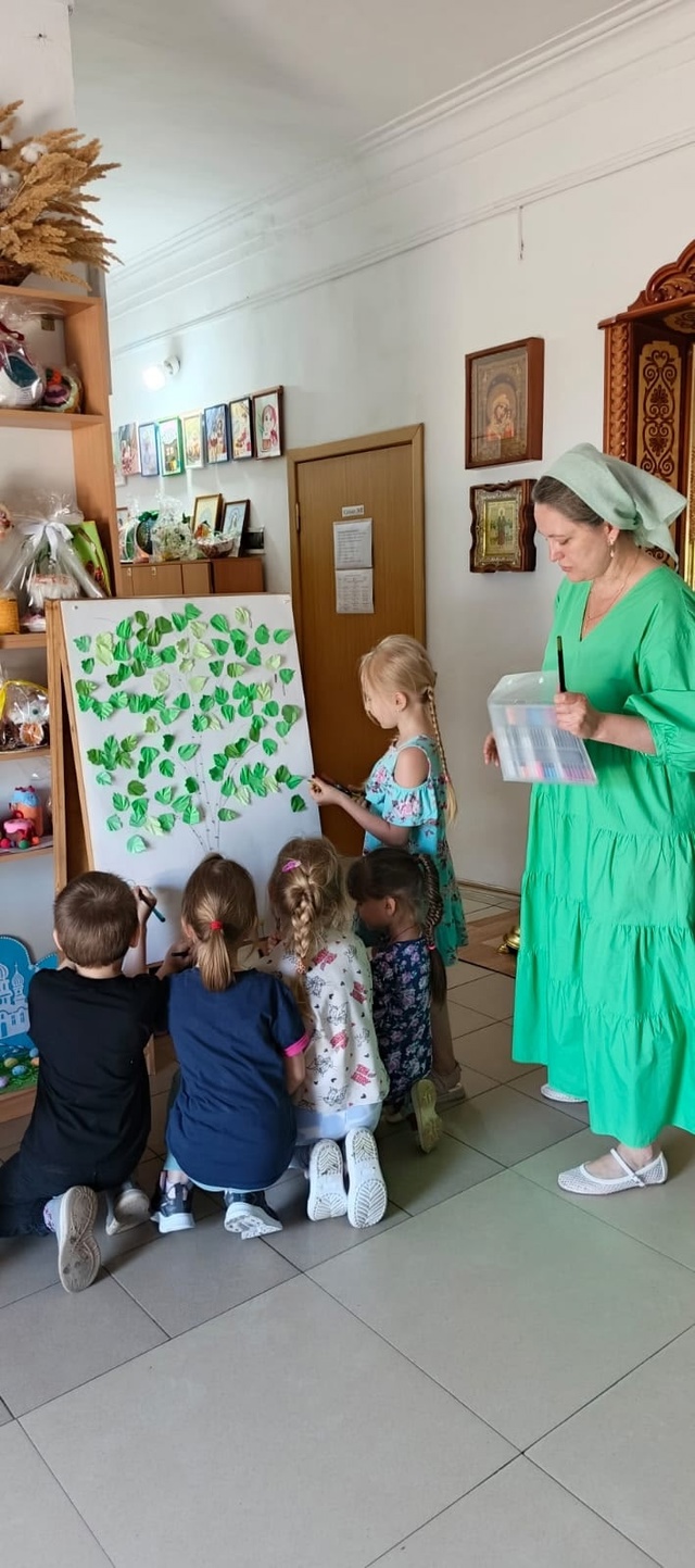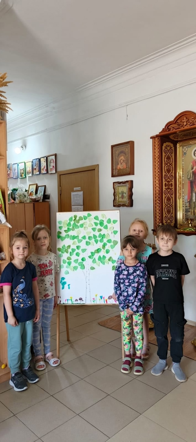 Татьяна Юрьевна рассказал детям о том, в чем смысл праздника и почему этот день считается днем рождения Церкви. Также ребята узнали, почему в эти дни все вокруг украшают зеленью и цветами.