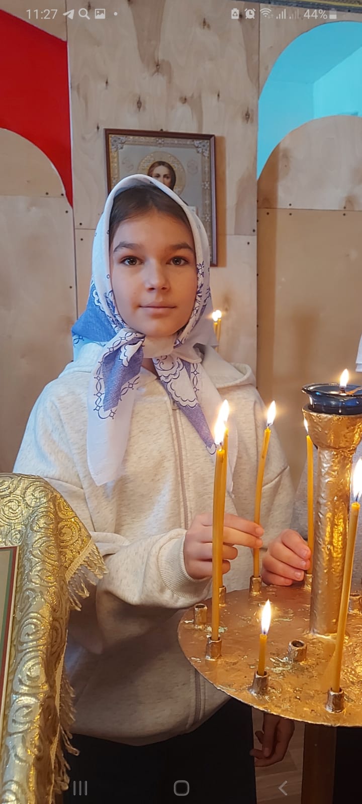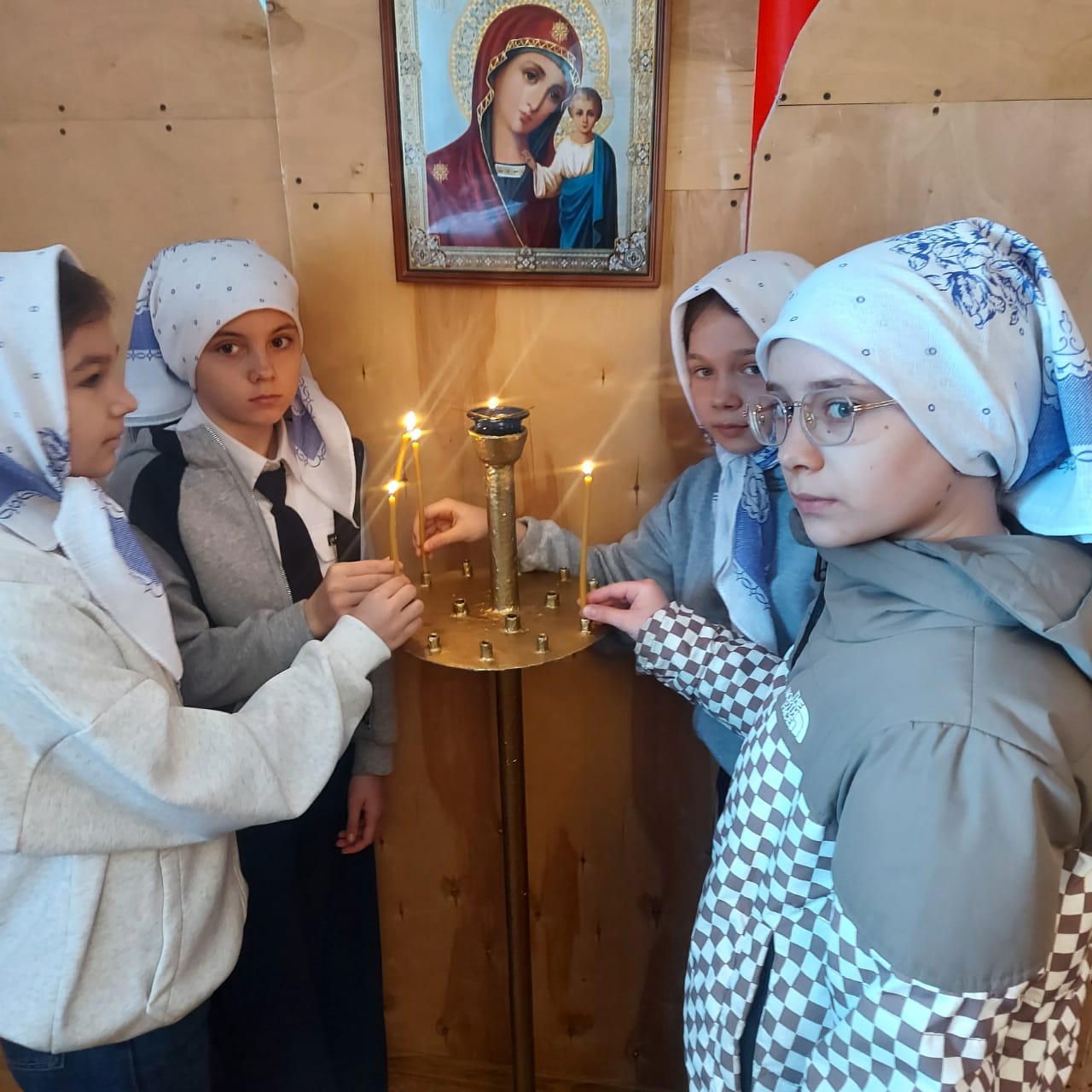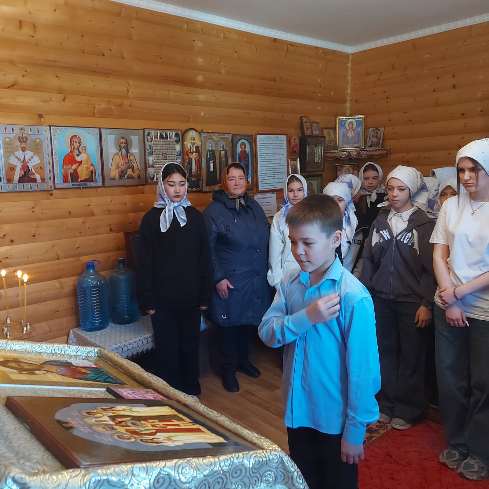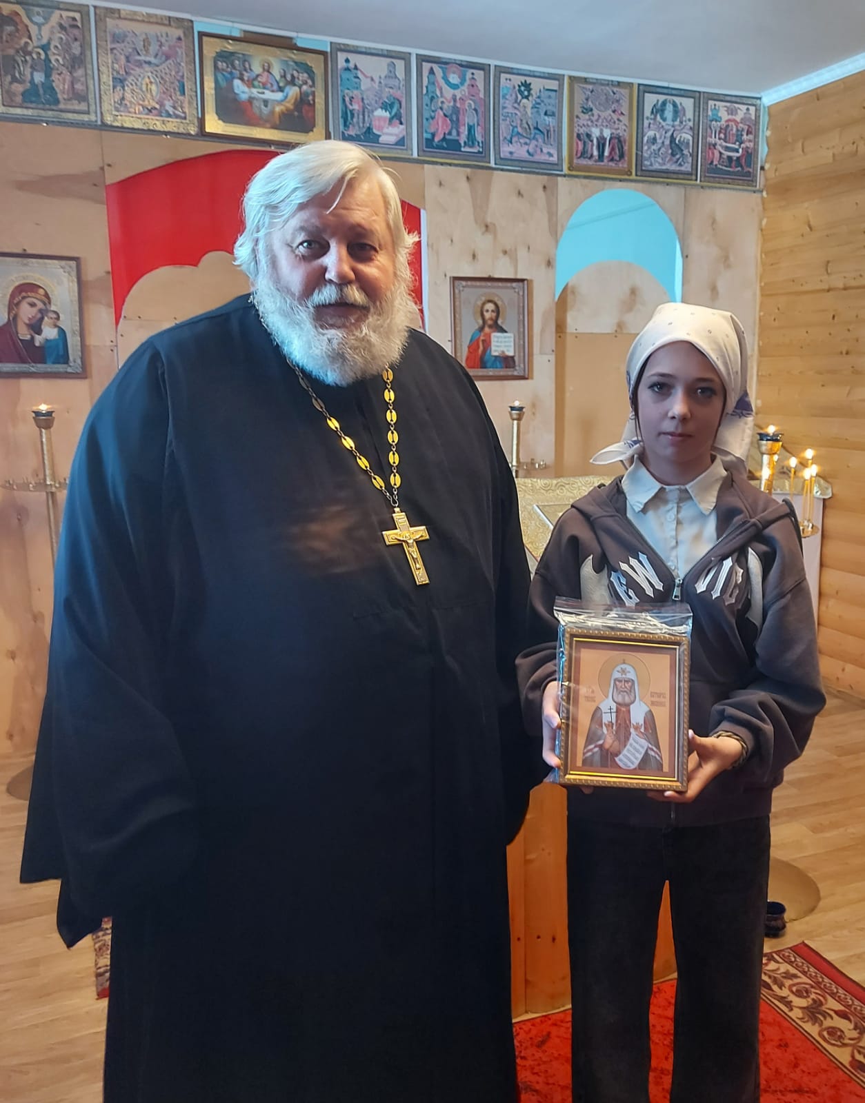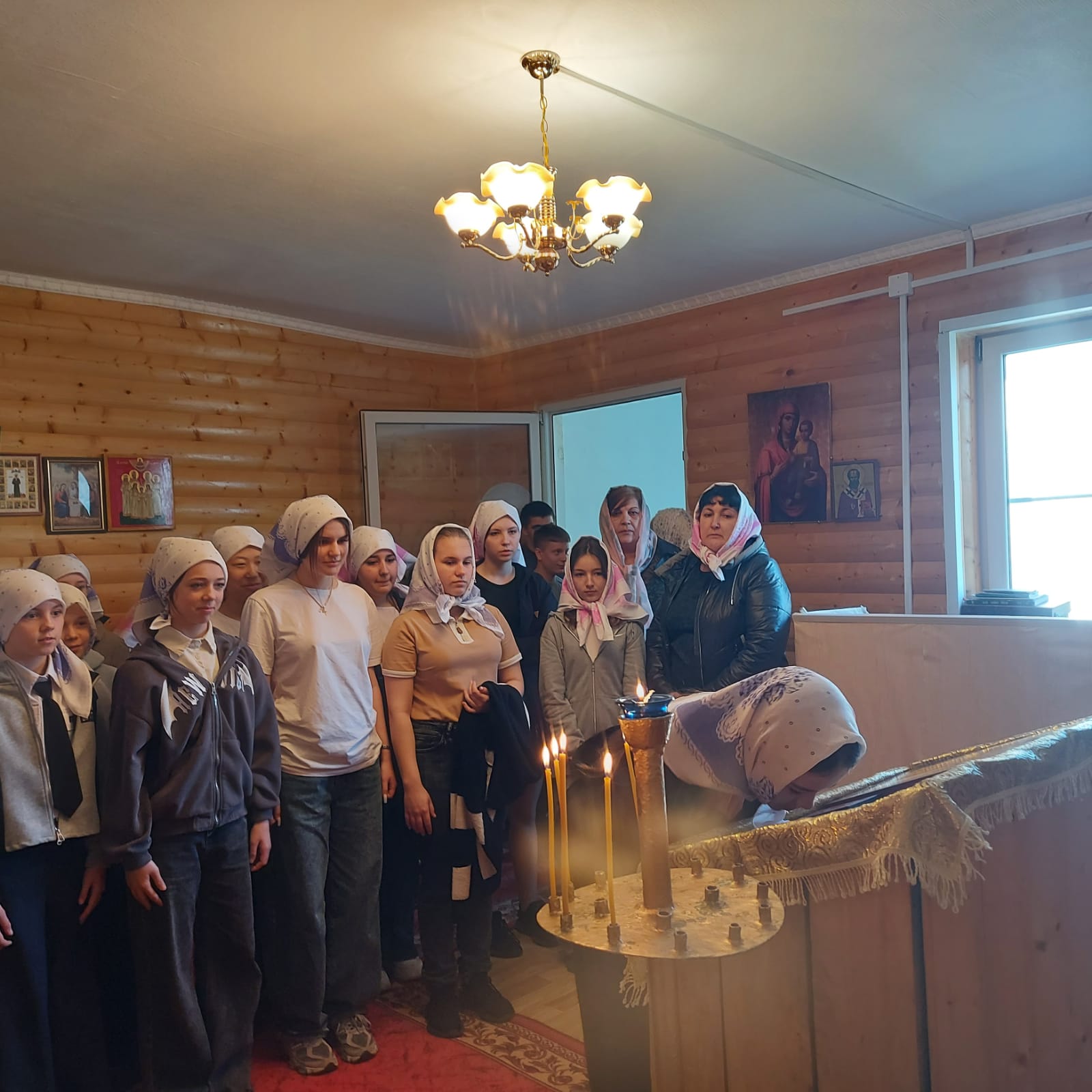 Школьники и педагогический коллектив школы во главе с директором посетили молельный дом в честь Царственных Страстотерпцев пос. Привольный, передали в дар икону святителя Тихона, поставили свечки и написали записочки о здравии своих родных и близких.