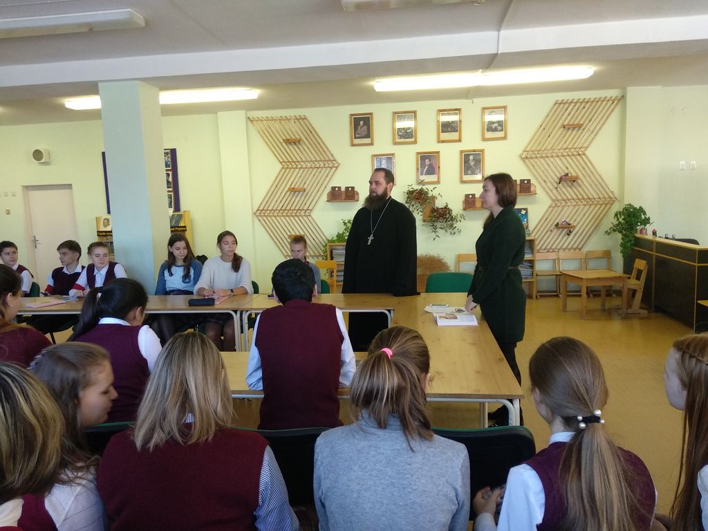 В ходе урока преподаватель Инна Александровна знакомила учащихся с новой темой и попутно при участии иерея Романа обсуждала вопросы, возникающие у учеников.