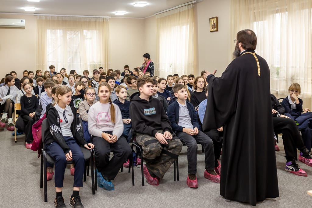 В праздник Введения во храм Пресвятой Богородицы учащиеся 5-х классов гимназии № 10 г. Шахты посетили Покровский кафедральный собор. Школьники приняли участие во встрече со священнослужителем в преддверие праздника Дня героев Отечества. Настоятель кафедрального собора иерей Александр Теличкин выступил перед аудиторией с лекцией на тему «Осмысление героизма и подвига в рамках духовной жизни». Отец Александр привел примеры исторических личностей и рассказал о том, что подвиг складывается из самых простых, но важных поступков, в основе которых лежит работа над собой, ответственность, преданность высоким и нравственным убеждениям, а героизм не проявляется по запланированному ходу событий и является выражением правильного внутреннего настроя человека и его отношения к жизни в целом, где в основе лежит принцип самопожертвования как проявления любви к окружающим людям.
