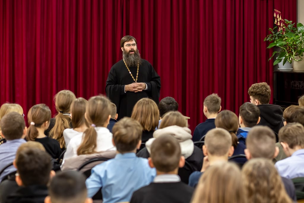 Так же значительную часть выступления священник посвятил тому, что необходимо чтить память своих предков, дорожить честью, достоинством и наследием Великой Державы. В ходе общения школьники смогли задать волнующие их вопросы и обсудить самый широкий круг тем.