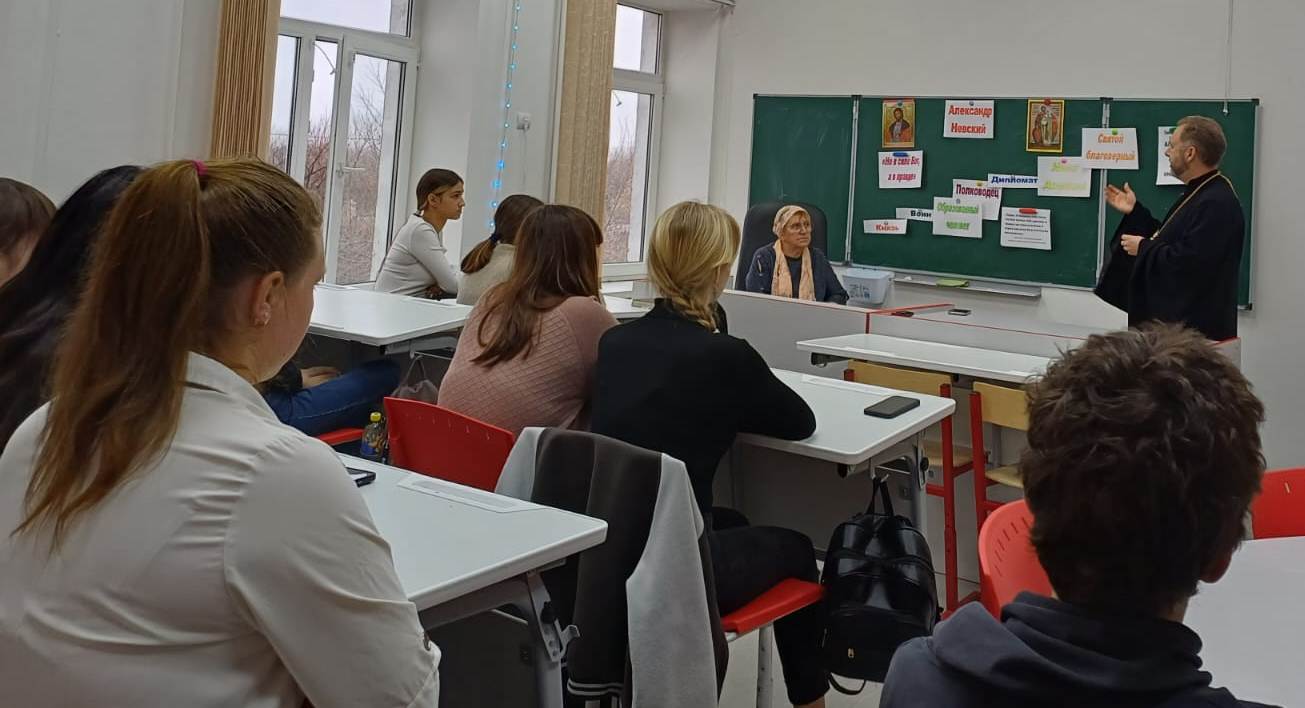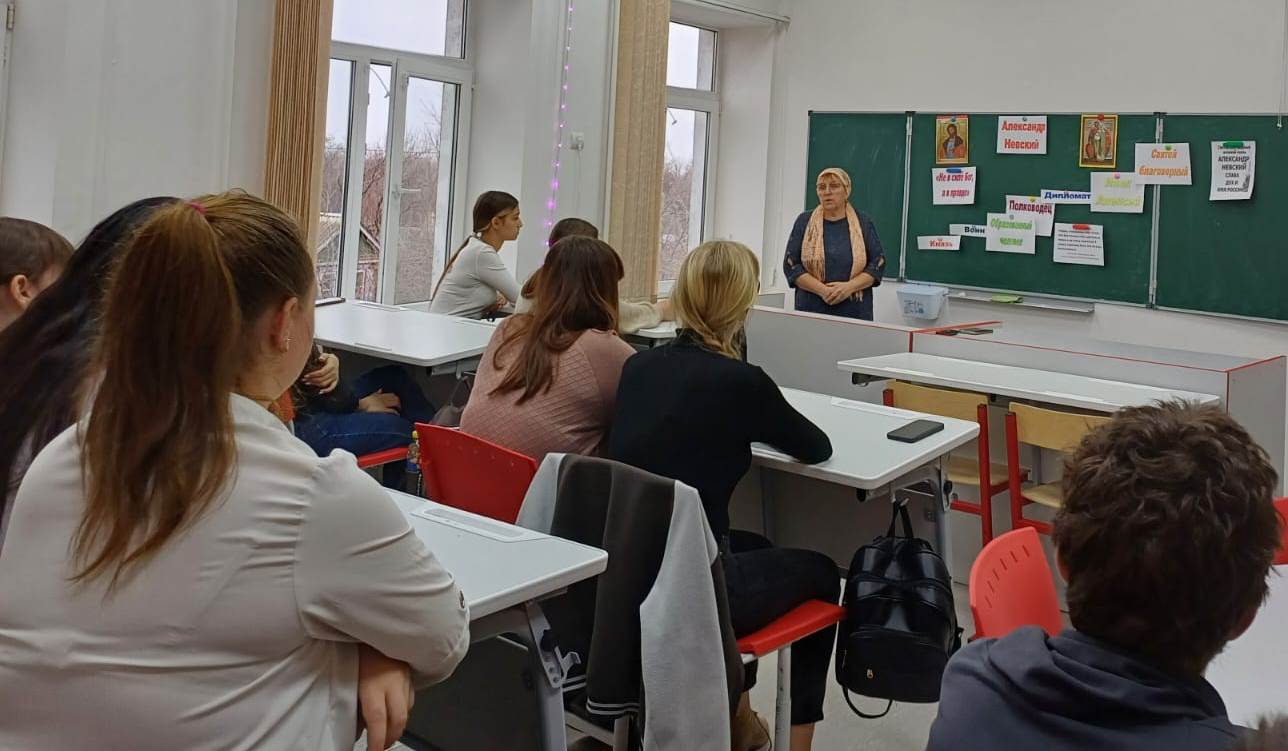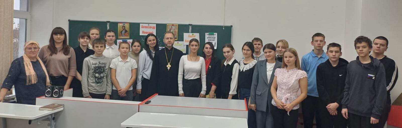 Священник поздравил учителей и учащихся 8 и 10 классов с праздником и поставил цель урока – познакомить учащихся с духовным подвигом святого благоверного князя Александра Невского, узнать духовные аспекты его жизни и влияния на историю России.