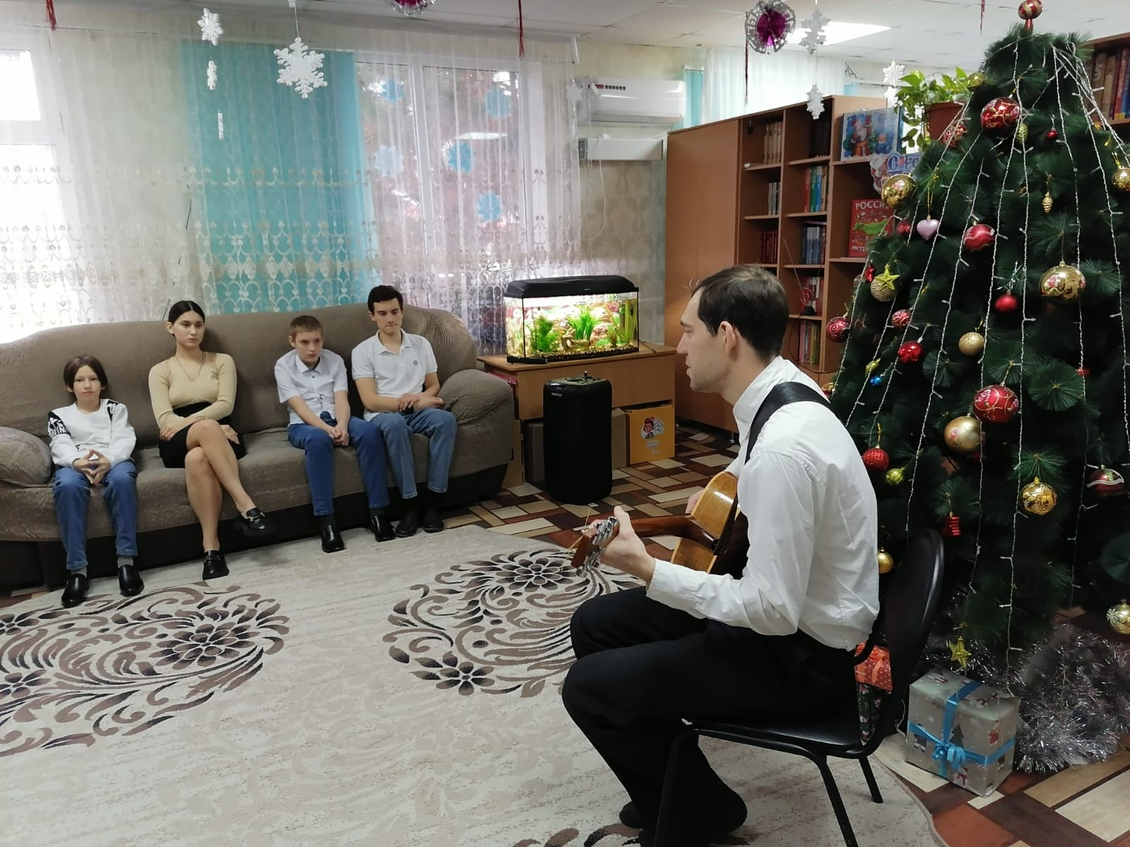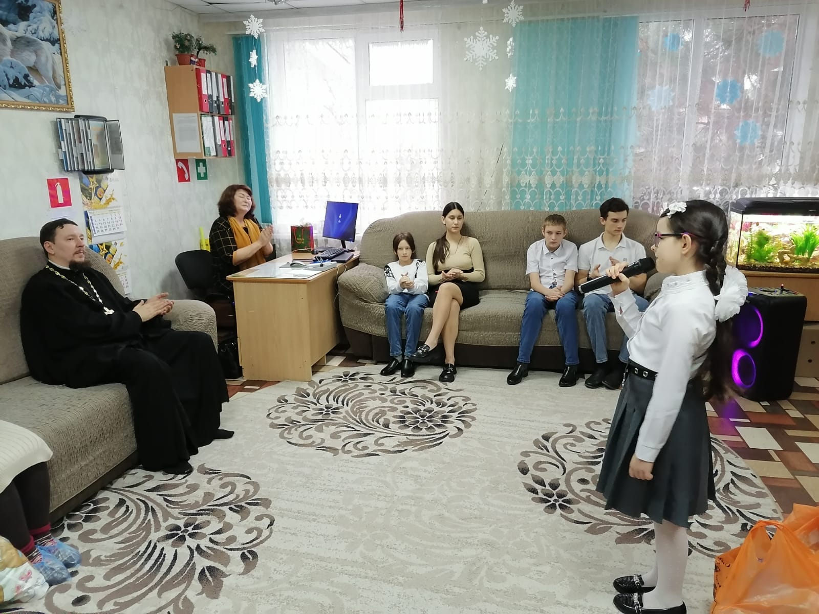 Вначале с приветственным словом и добрыми пожеланиями к воспитанникам обратился отец Роман. Он объяснил детям суть праздника, поздравил с Рождеством Христовым, а дети воскресной школы подготовили концерт. Звучали песни, стихи, прославляющие Бога.
