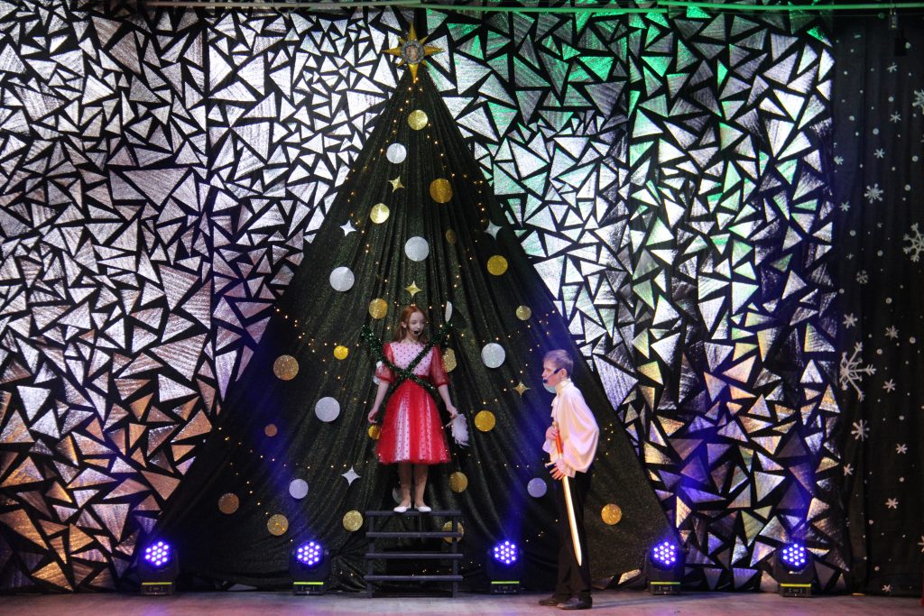 Это история о том, как брат Миша и сестра Катя чудесным образом оказываются на ветвях Рождественской ели. Чтобы вернуться домой им нужно найти выход и одержать победу над коварством злых сил. По пути дети встречаются с ожившими елочными игрушками, которые помогают им преодолеть все испытания. Много радостных и волнительных моментов пережили начинающие артисты на сцене. Зрителей покорили озорные белки и непосредственные свечечки.
