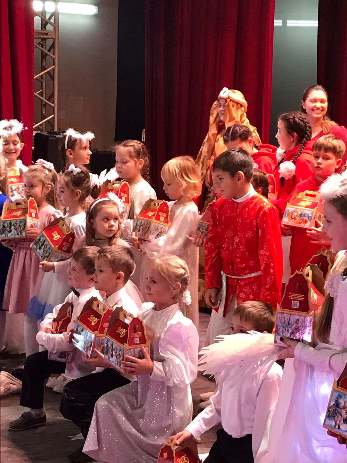 Все участники праздника, а было их более 130 человек, получили сладкие угощения от добрых, щедрых людей, которые откликнулись на призыв и приняли участие в сборе благотворительных средств на Рождественские подарки для старательных и талантливых ребятишек.