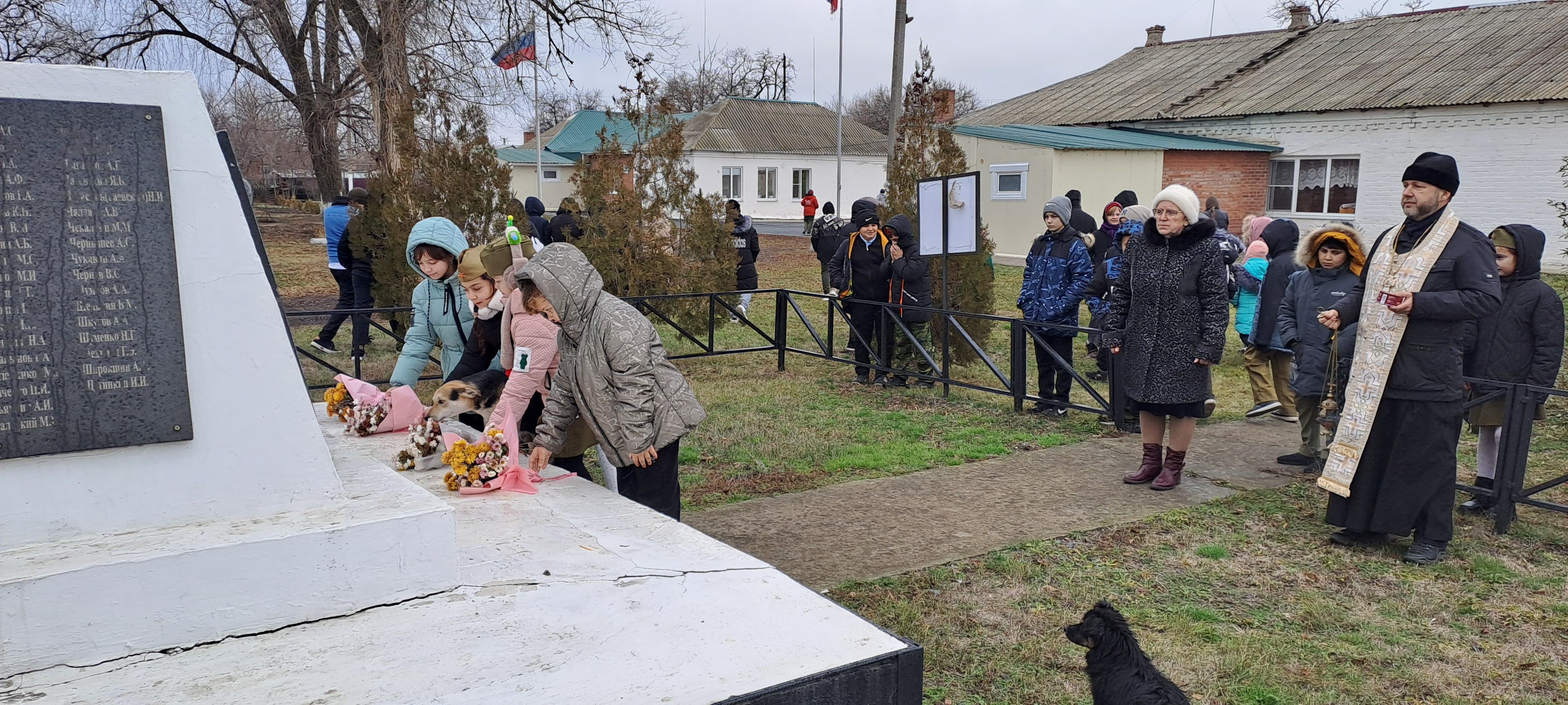 Мероприятие продолжилось у братской могилы воинов, павших в боях за х. Усьман в 1943 г. Протоиерей Роман отслужил заупокойную литию о всех, погибших в боях за Отечество. После совместной молитвы учащиеся возложили цветы к памятнику у братской могилы.